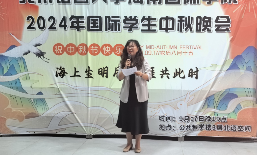 王阳副局长向远道而来的国际学生及所有嘉宾表示了热烈的欢迎,她介绍了海南黎安国际教育园区的发展过程和基本情况,对北京语言大学加盟园区、助力园区国际化水平表示感谢,强调北语是海南黎安国际教育园区建设的重要支撑,希望师生在园区工作顺利、愉快学习、收获满满,并祝福大家中秋佳节快乐!郁有学总督学为在场的200余名国际学生深入浅出地介绍了中秋节的起源、风俗习惯以及背后蕴含的深厚文化内涵。后羿射日、嫦娥奔月等古老传说让学生们听得津津有味,他们纷纷被中国传统文化的魅力所吸引,并跟随郁有学老师一起朗诵起了经典诗句“海上生明月,天涯共此时”“但愿人长久,千里共婵娟”,现场气氛温馨而感人。