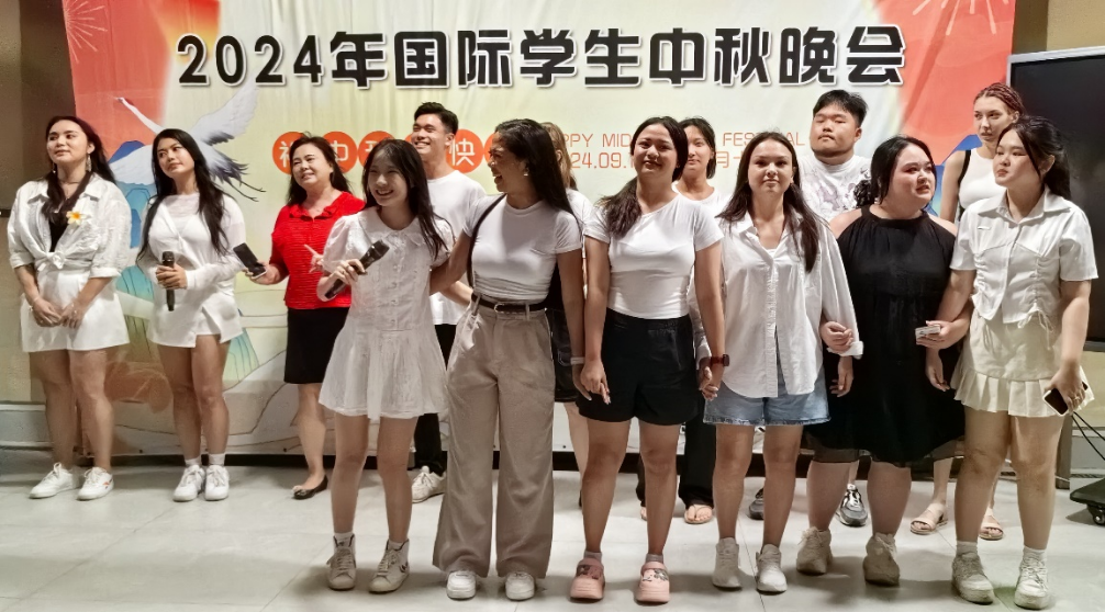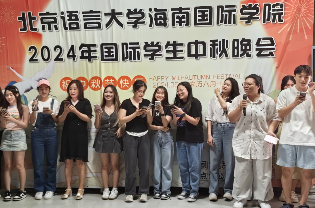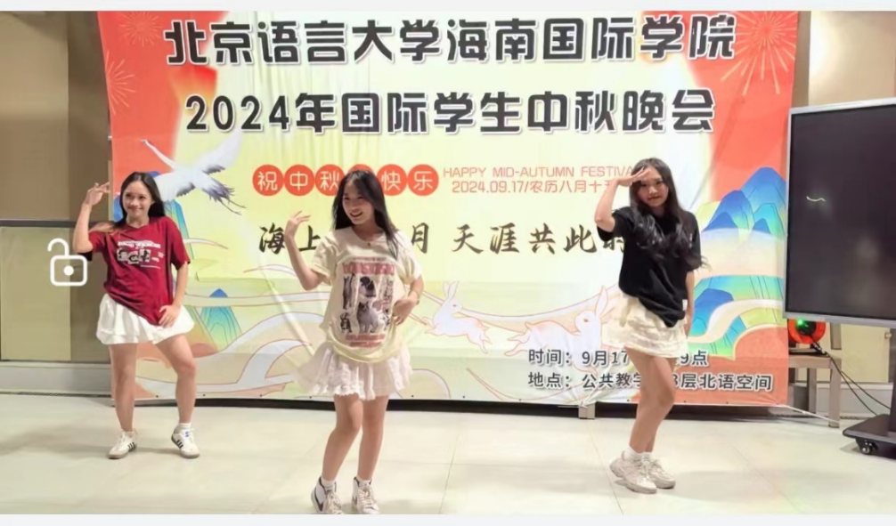 国际中文学院预科教育中心百余名国际学生、本科四年级赴琼语言文化实践百余名师生,或以班级、国家为单位、或以小组、个人为单位,献上了歌曲、歌舞等多姿多彩的精彩节目,越南兰英、秋玄等同学、泰国同学王妍霏等动感、优美的歌舞,各个班级、团队《有点甜》《要求》《月亮代表我的心》等等甜美高亢的旋律,都让大家沐浴着南国海风,沉浸在美妙的歌声里,虽远在南海之滨、抵御台风侵袭,大家感受着学校和家人的牵挂,品尝着国际中文学院本科实践团队带来的北语食堂的月饼、黎安国际教育创新实验区赠送海南国际学院的月饼,一起度过了欢快难忘、其乐融融的中秋之夜。