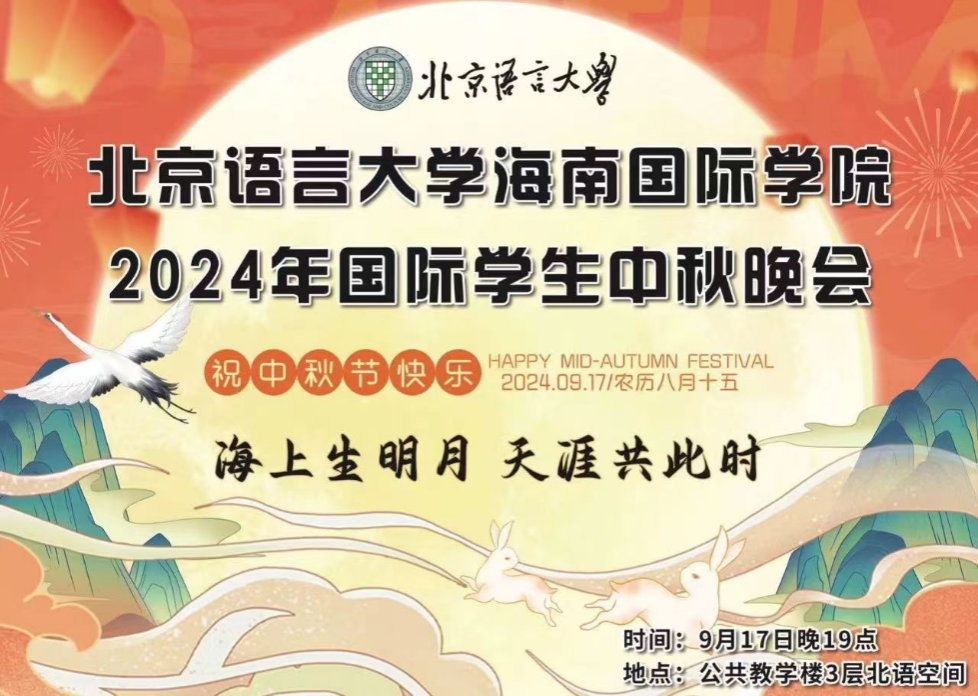 9月17日是中国农历中秋佳节,我校海南国际学院举办中秋夜联欢晚会,段鹏校长、海南黎安国际教育创新实验区管理局副局长王阳亲致贺词,海南国际学院总督学郁有学、工委书记仵志勇、国际中文学院党委书记梁彦民、副书记别红樱,以及国际中文学院预科教学团队师生、本科语言文化实践团队师生共260余人欢聚一堂,共庆中秋佳节!