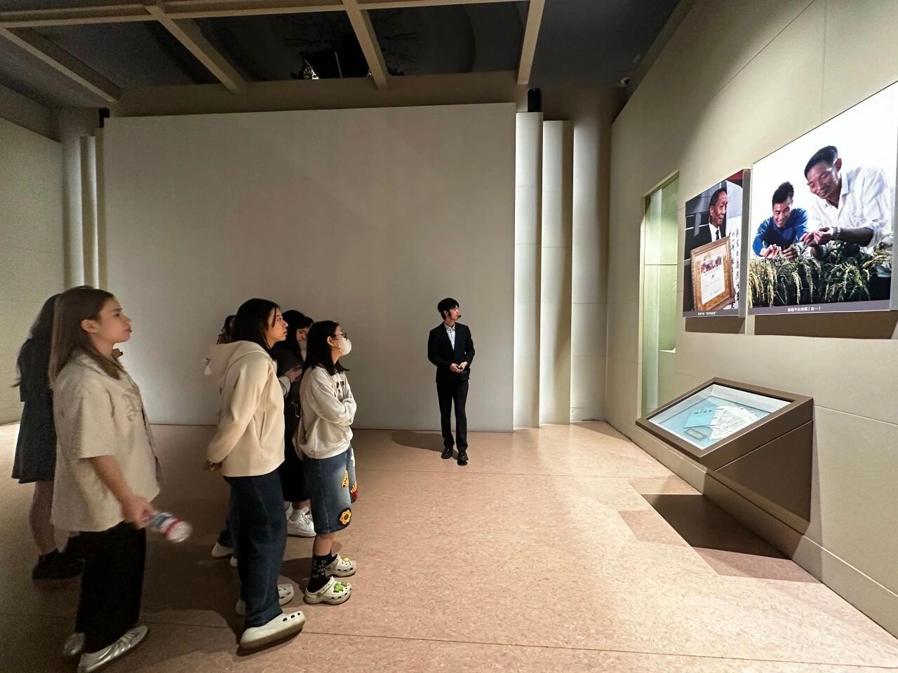 师生们首先参观了中华农业文明陈列馆,系统了解了中国农业从新石器时代至今约五千年的辉煌历程。大家沉浸于彩陶展、农具展及中国土壤标本展中,深度领略了中国传统农耕文化的特色与魅力。参观伊始,留学生们在“农耕五祖”雕像前驻足聆听讲解,并在五色土地砖上感受中华农业文明的深厚根基。