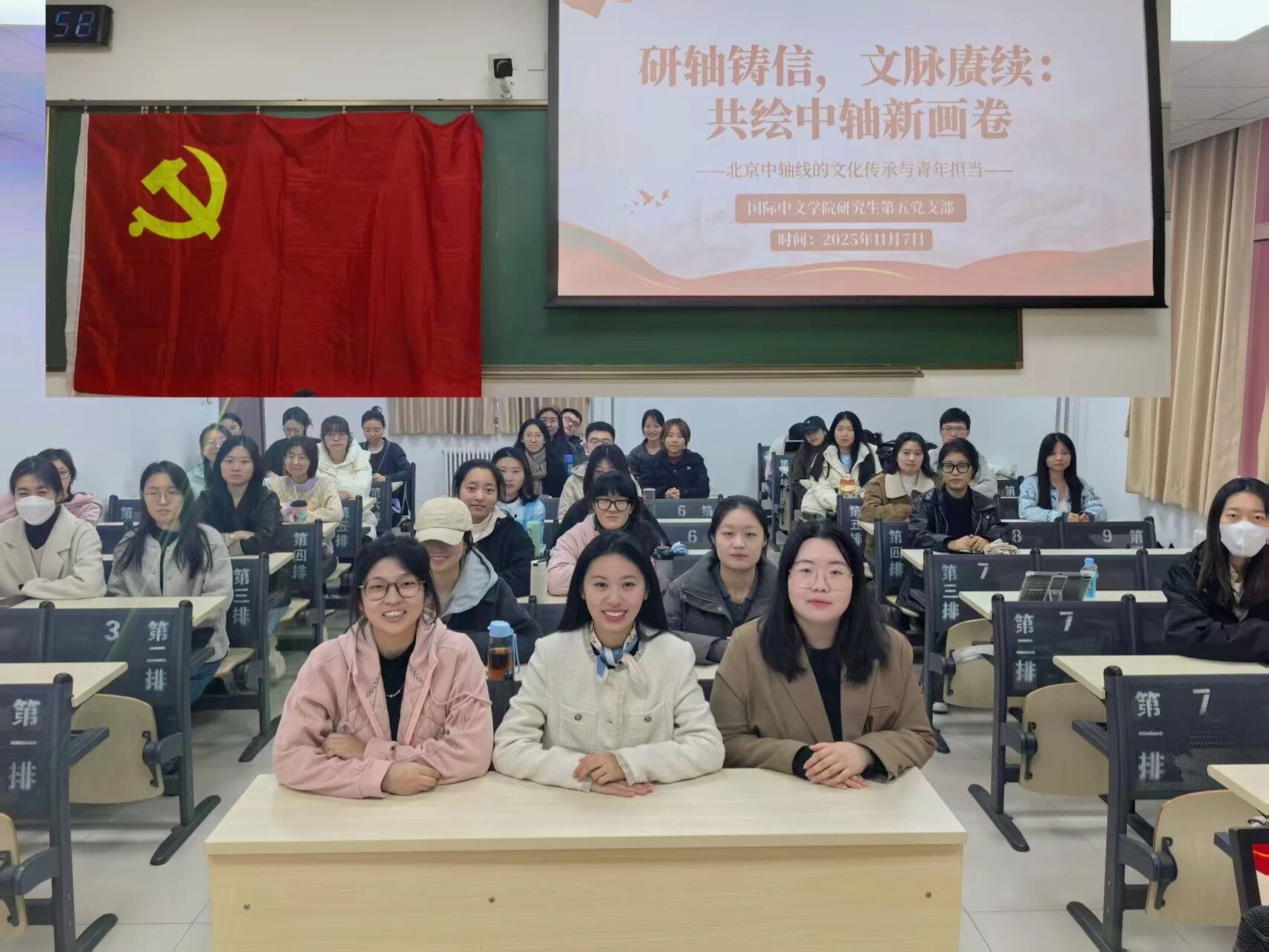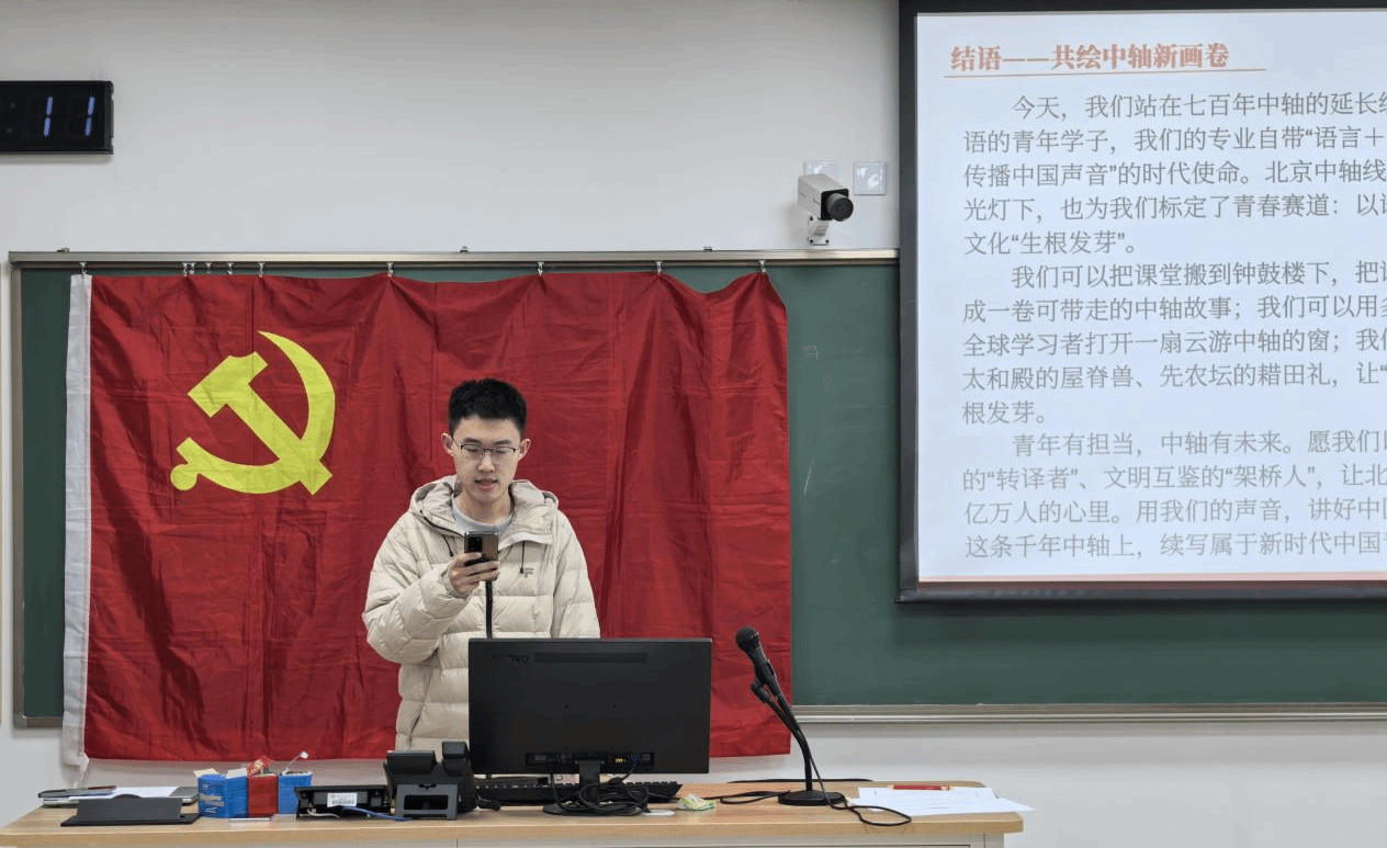 2025年11月7日,国际中文学院“桐声”宣讲活动在教二楼107教室温情开讲。本次活动以“研轴铸信,文脉赓续:共绘中轴新画卷”为主题,通过故事讲述、历史回顾与实践创新,带领师生沉浸式领略北京中轴线的文化魅力,激发青年传承中华文化的责任与热情。