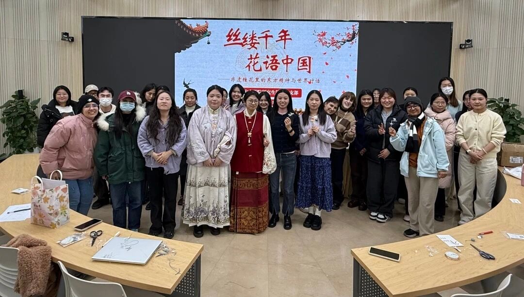 为传承中华优秀传统文化、弘扬工匠精神,增强青年学生的文化认同,国际中文学院研究生第五党支部在学院“五色交辉”工作室指导下,于2025年12月1日举办“丝缕千年,花语中国——非遗缠花里的东方精神与世界对话”文化体验活动。活动在教二101教室展开,辅导员黄梓芳与近三十名中外学生共同参与。支部学生干部身着汉服,从理论讲解到手作体验,带领大家沉浸式感受缠花技艺的魅力,现场互动热烈,反响积极。