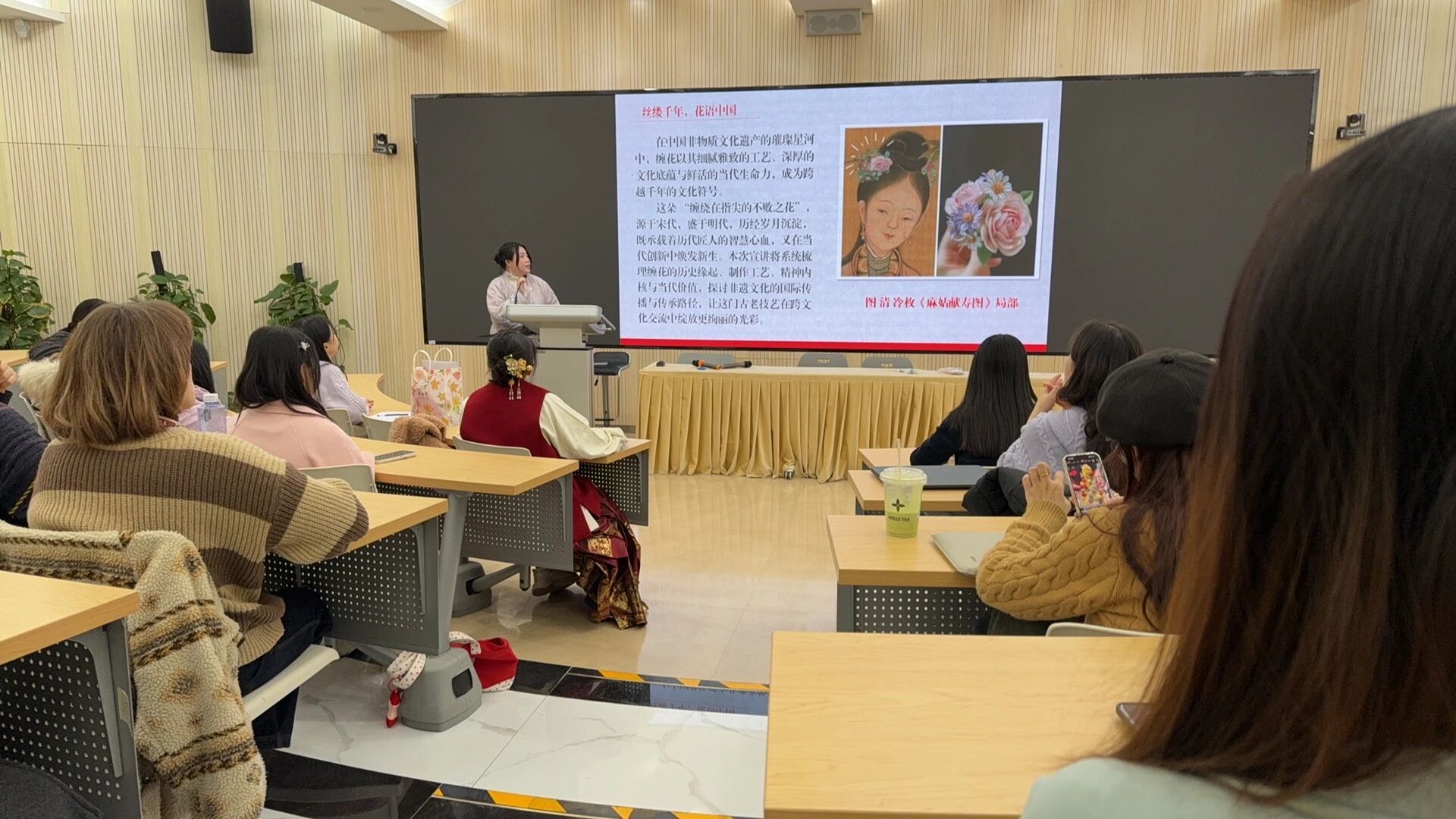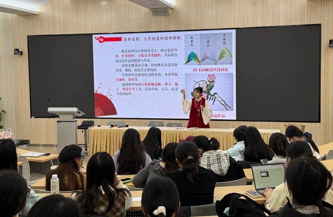 活动伊始,刘欣悦同学围绕缠花的历史渊源、艺术特征与文化价值展开。她从宋、明、清三代的工艺发展讲到缠花在现代非遗体系中的传承意义,条理清晰,内容翔实,使同学们对缠花技艺的文化根脉有了系统认识。