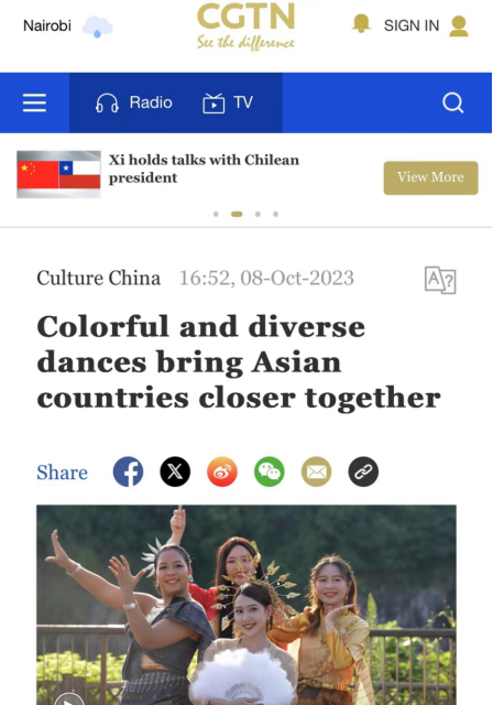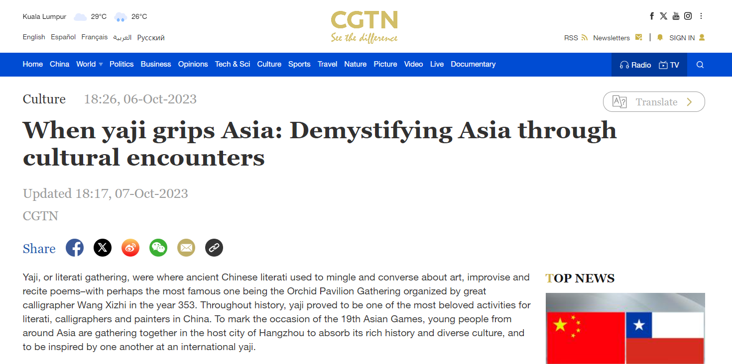 杭州亚运会举办期间,中央广播电视总台英语环球节目中心推出特别节目《湖山雅集》,经过层层选拔,北京语言大学的20余名国际学生参加节目录制。来自泰国、越南、缅甸、老挝、印度尼西亚和蒙古国等国家的北语学子相聚杭州,探访良渚遗址公园、西泠印社、杭州西湖等文化景区,“雅集”在移步换景间,同学们通过古筝、古诗今唱、民族舞蹈等多种表演形式,以体育之名,搭文化之桥,聚亚洲之力。