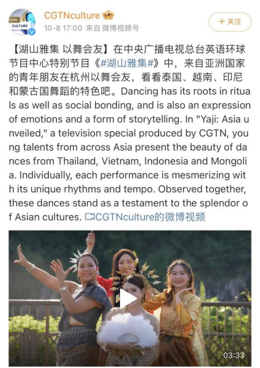 “ 这个视频不仅仅是为了展示各个国家舞蹈的魅力和独特性,更重要的是通过舞蹈的形式传递各个国家的文化、价值观和精神内涵。在拍摄过程中,我深刻感受到杭州作为一个现代化城市的活力和创造力。”
