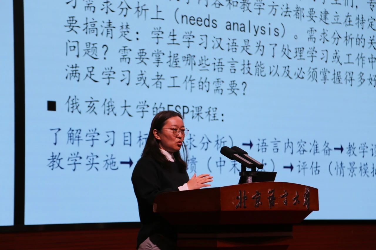 黄梅老师以《专门用途汉语教学的发展困境和创新思路——以商务汉语教学为例》为题,对专门用途汉语在发展过程中所面临的困境进行了较为清晰的分析和概括,为进一步研究专门用途汉语教学问题、教材设计和师资培养提供了有益的思路和建设性意见。