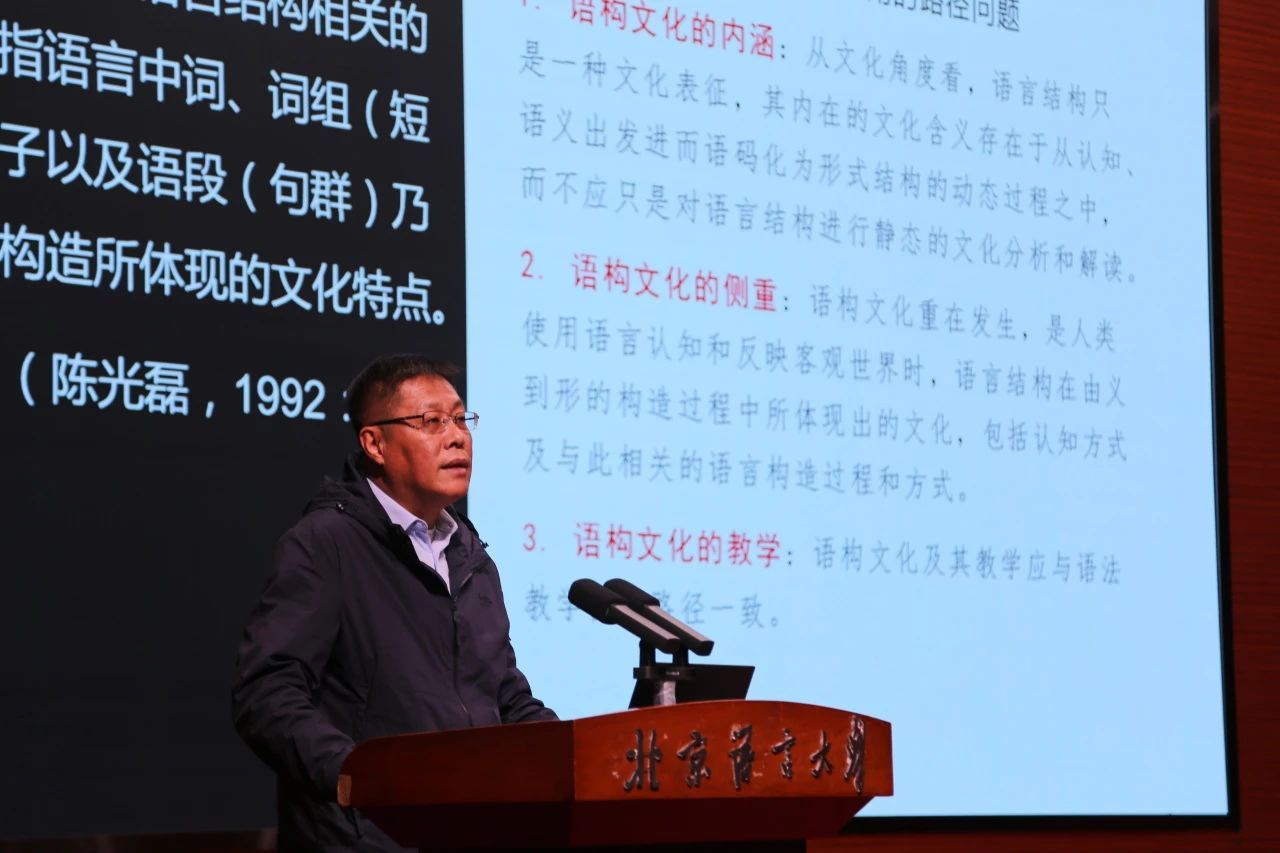 韩玉国老师以《试论语构文化及其教学的认知视角》为题,回顾了上世纪九十年代学界关于文化教学讨论,揭示了语构文化理论和应用之间的视角错位问题。报告进一步讨论了认知语言学的语构文化意义,梳理出我国学者立足于汉语对认知语言学文化转向的认识,从认知视角、认知语言学为我们深刻理解语构文化的发生并应用于教学廓清了方向。