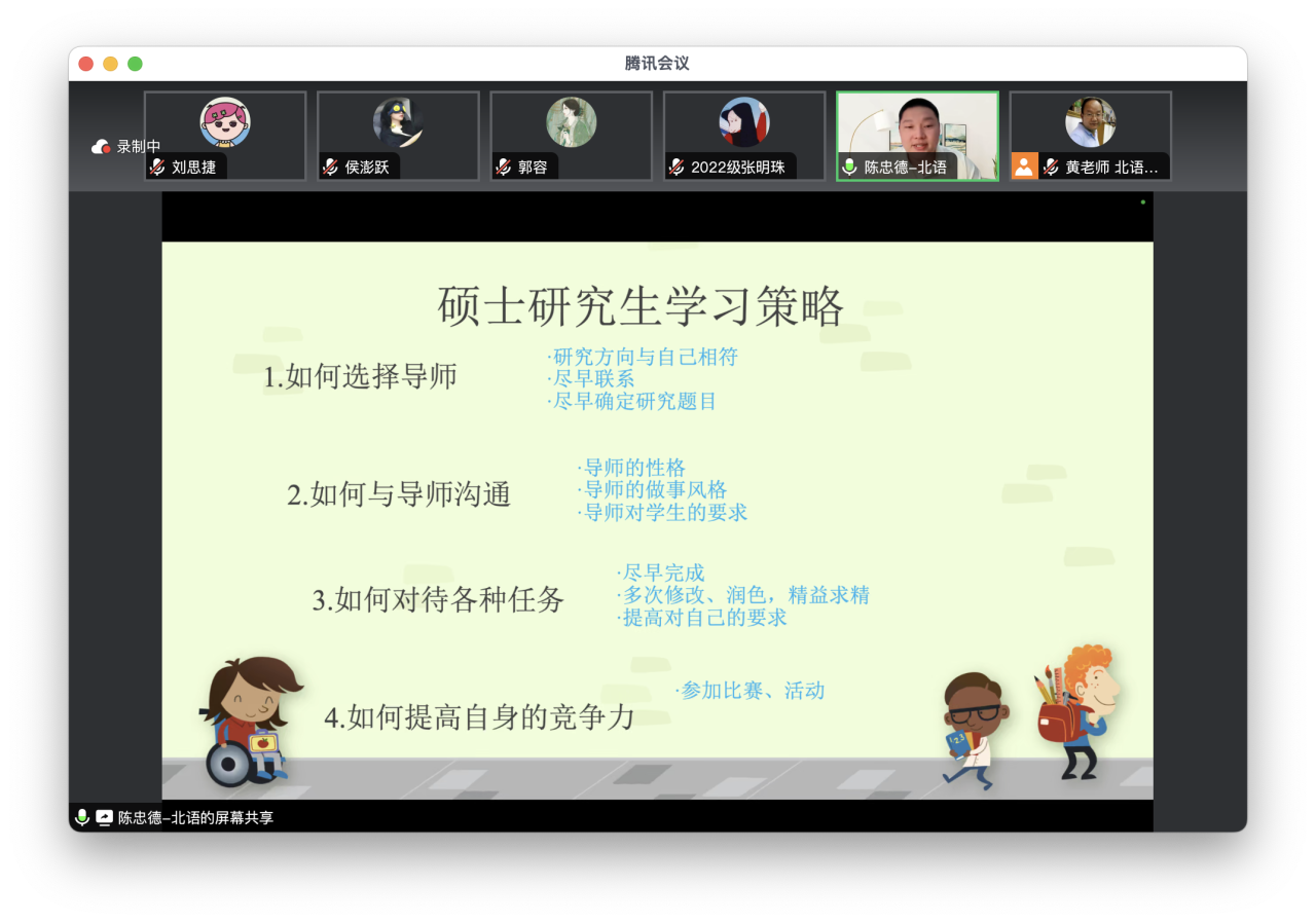 在优秀学子论坛上,优秀中研在校生张明珠、优秀海外志愿者刘文琳、优秀外研毕业生陈忠德作为代表,围绕研究生阶段的课程安排、学术科研、志愿活动、学校活动、研会工作、海外孔子学院教学实践、硕士阶段的学习策略与社交经验等方面与营员们进行了干货满满的分享,并鼓励营员们奋发向上,在充实的校园生活中磨炼意志、积累经验,践行“让中文走向世界,让世界向中国走来”的使命和担当。交流互动环节,营员们踊跃提问,气氛热烈。