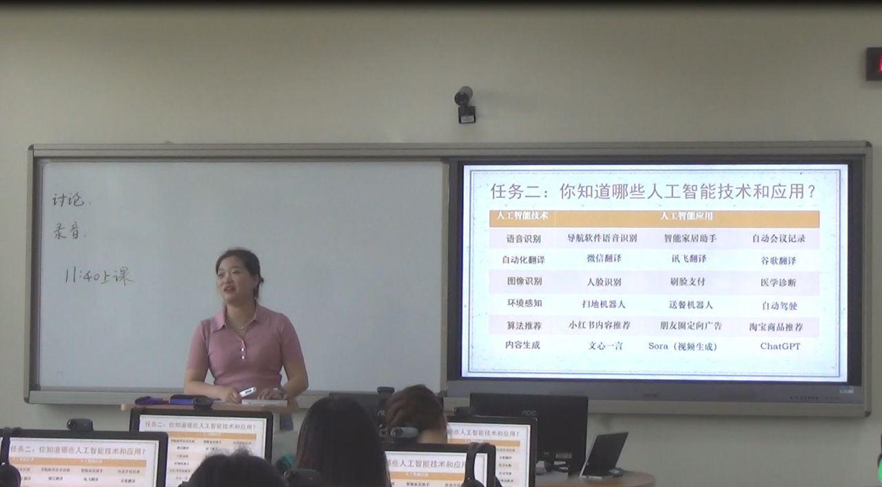 课上,吴老师首先带领学生总结了各种类别的手机应用软件,而后指导学生完成了三个任务——任务一:“推荐一款手机应用软件”,老师给出推荐要点,学生进行对话,并在对话练习的基础上进行成段表达的录音。任务二:“你知道哪些人工智能技术和应用?”老师用视频材料引入人工智能的话题,随后列表分类展示,引导学生说出具体内容。任务三:“我们应该如何看待人工智能?”老师先让学生看图说话并发表自己的意见,随后学生分组讨论人工智能的优点、缺点以及合理使用人工智能的问题,然后按照“小组讨论报告框架”进行表述。
