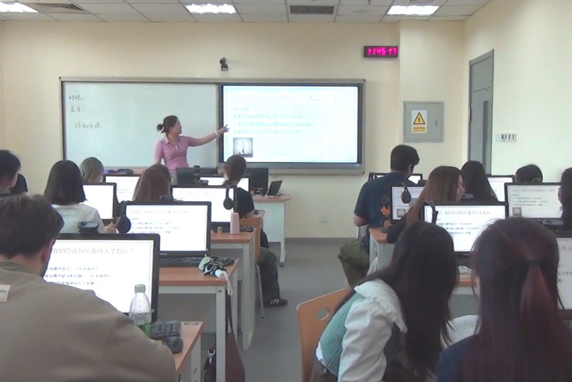 “吴雪钰老师的公开课教学环节完整清晰,师生互动充分,学生的表达积极主动,课堂气氛活跃,教师始终笑容可掬,极具亲和力,令学生如沐春风。教师通过展示‘词汇工具箱’和‘表达结构框架’、播放视频、提问、小组讨论、现场录音、播放学生录音并点评等环节引导学生口头操练,教学手段多样,教学效果显著。值得一提的是,教师把教材中‘网络生活’主题扩展到AI技术,使教学内容紧贴时代热点,也引起了学生的学习兴趣,激发了学生表达的积极性,这也体现出教师在教学设计中的与时俱进意识和收放自如的灵活性。”