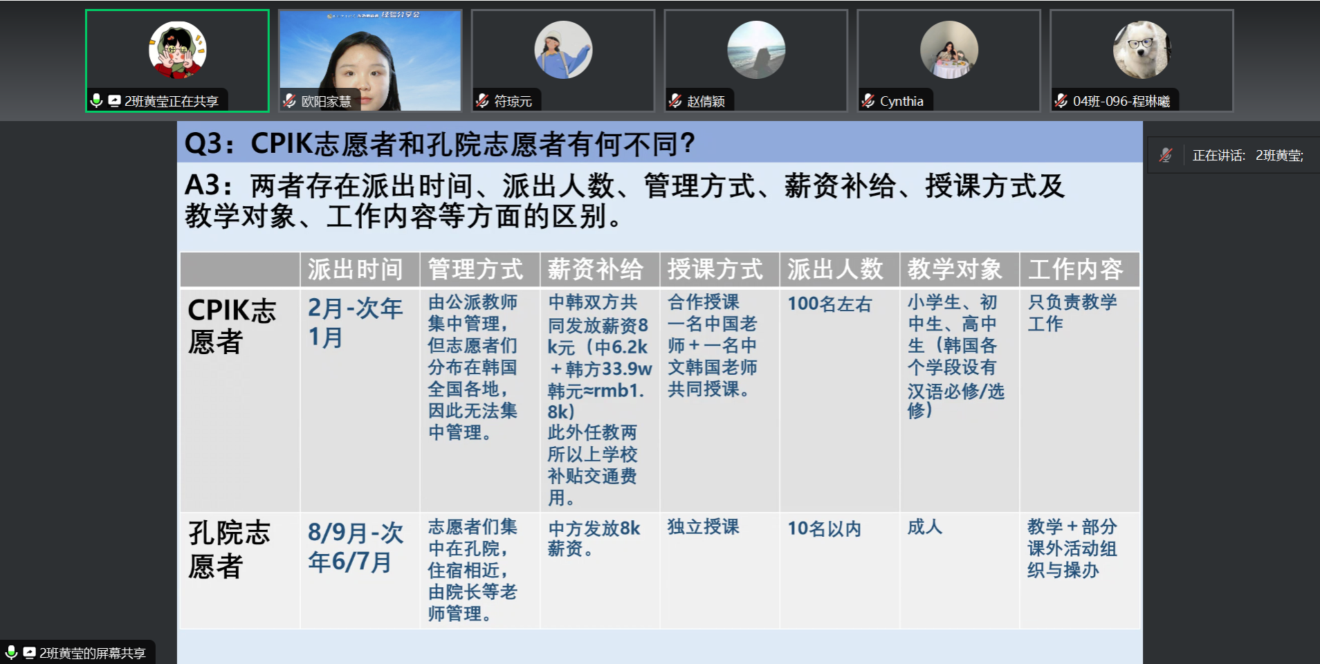 首先,黄莹同学从多个角度介绍了她在韩国作为CPIK志愿者的经历。她详细讲解了志愿者面试准备、CPIK志愿者的定义及与孔院志愿者的区别等内容。她表示,韩国的志愿者经历不仅提高了她的生存技能,还让她更加深入地认识了自己。