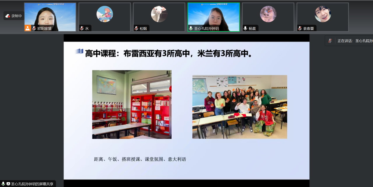 孙钟玥介绍了她在米兰的志愿者经历,包括志愿者数量、教学点分布、课程类型等。在米兰,她们要教授从幼儿园到大学的学生,挑战巨大。在最后,她说老师要不断丰富自己,提升教授不同年龄段学生的能力。