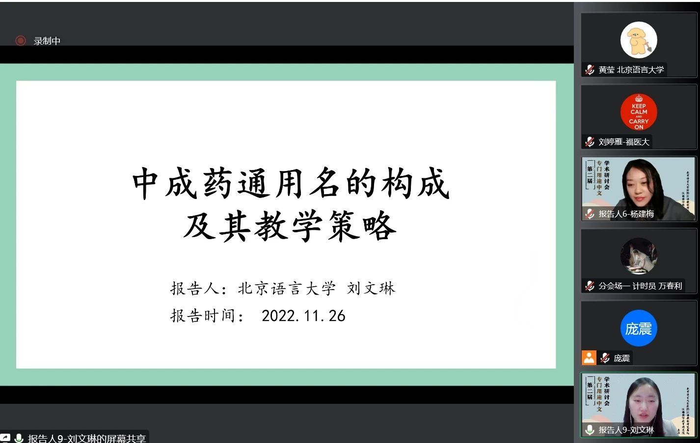 2022年参加“第二届专门用途中文学术研讨会”,报告题目《中成药通用名的构成及其教学策略》。