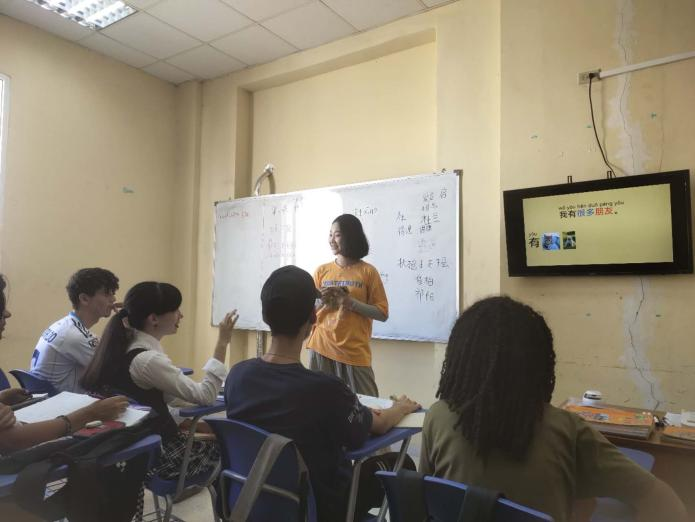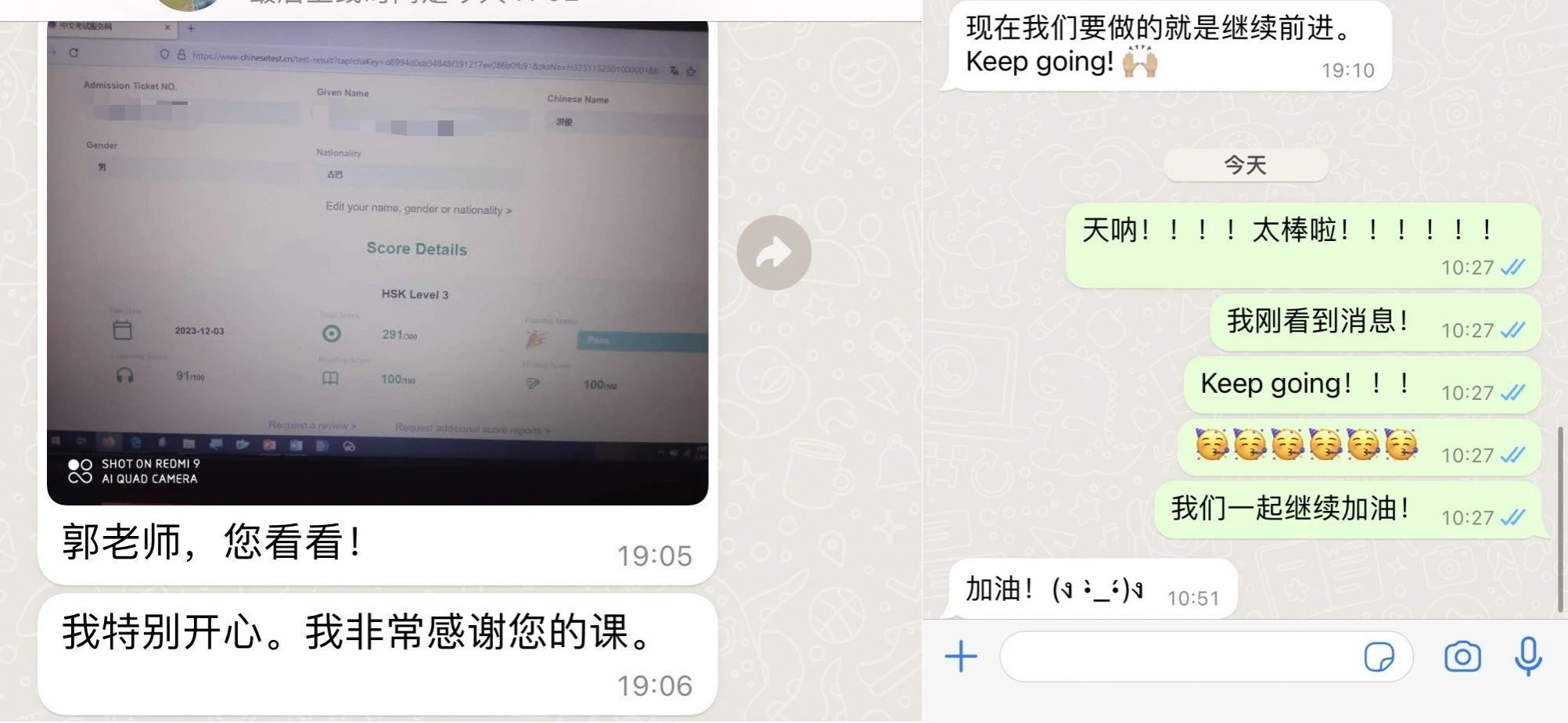来到孔院后,我第一次接触了HSK考试的相关工作,不仅负责了总的考务工作,也是HSK3的短期班老师。考务工作很细碎,还好有经验丰富的老师带着我,顺利地完成了考试前的筹备和考试当天的全部工作。有意思的是HSK课程,第一节课我自信满满地觉得会报考HSK3的学生都有一定的汉语能力了,短期提高班的重点应该在“提高”,结果第一节课对学生的汉语水平做了评估后,我傻眼了,学生的整体水平都不理想,HSK3的语言点复习提高课硬生生变成了节节新语言点讲解课。效率太低,学生迷茫不说,每节课就按照这种进度根本没法参加考试。后来和学生商量后,我决定把每周两节的HSK3课程变成HSK1-3的干货答疑课。在用一套HSK3模拟题“恐吓”学生不能轻敌要提高警惕后,学生配合度直线提高。学生课前要做两项工作,一完成一套真题练习,二从我整理、划分好的HSK1-3的语言点、生词表里挑出自己有问题的内容发在群里,再用其他没问题的语言点和词分别造句。这些被学生挑出来的语言点和词就是下节课的重点,我舍弃了课程里的各种结构,一上课就开始和同学们一起“扫雷”,最开始学生很紧绷,后面通过我讲的语言点、写在白板上的各种例句,可以举一反三,在问题上再提出问题,高密度的语言知识问题不仅培养了他们对汉语语法使用时敏感度,也不断在推着我精进扎实自己的知识储备。我先讲解,学生造句,再提问。一节课下来学生和我都口干舌燥。再后来班上多了几个HSK4的学生,他们说我的课可以帮他们夯实基础,(我懂,毕竟真的很干!)。考试结束当天,收到了学生的短信,说很感谢我的语法课,他觉得自己这次考得不错。果不其然他这次考了291,9分扣在听力上。“老师,我们一起继续加油!”