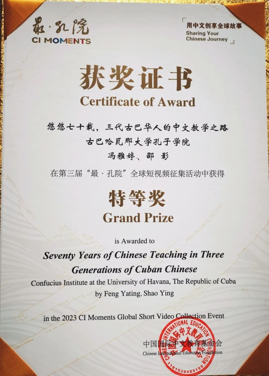 国际中文学院冯雅婷、邵影同学在第三届“最·孔院”全球短视频征集活动喜获殊荣,其合力拍摄制作的《悠悠七十载,三代古巴华人的中文教学之路》视频从61个国家102所孔子学院精心制作的351部作品中脱颖而出,拔得头筹,被评为“特等奖”。冯雅婷同时荣获了全球“孔院达人”称号。从影片筹拍到完成,古巴哈瓦那大学孔子学院给予了新媒体小组全方位的支持与帮助。