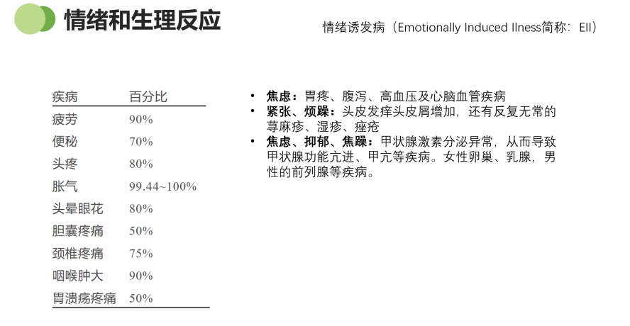 此外,同学们的情绪还与同学们的生理反应息息相关,这种由情绪引起的病症同学们称为情绪诱发病(EII)。同学们生活中一些久病难愈的生理病痛也许并不是生理问题,而是长期负面心境的躯体症状。