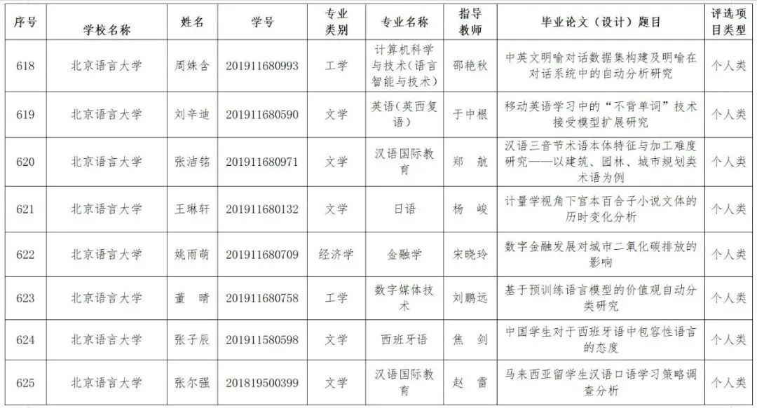 2023年7月,根据北京市教委《关于开展2023年本科生毕业设计(论文)评优工作的通知》要求,北京语言大学启动市级优秀本科生毕业设计(论文)推荐、选拔工作。经学部(院、系)推荐、校内专家评审、教学专门委员会审议、校领导审批通过,最终推荐上报张尔强等8名同学的论文。