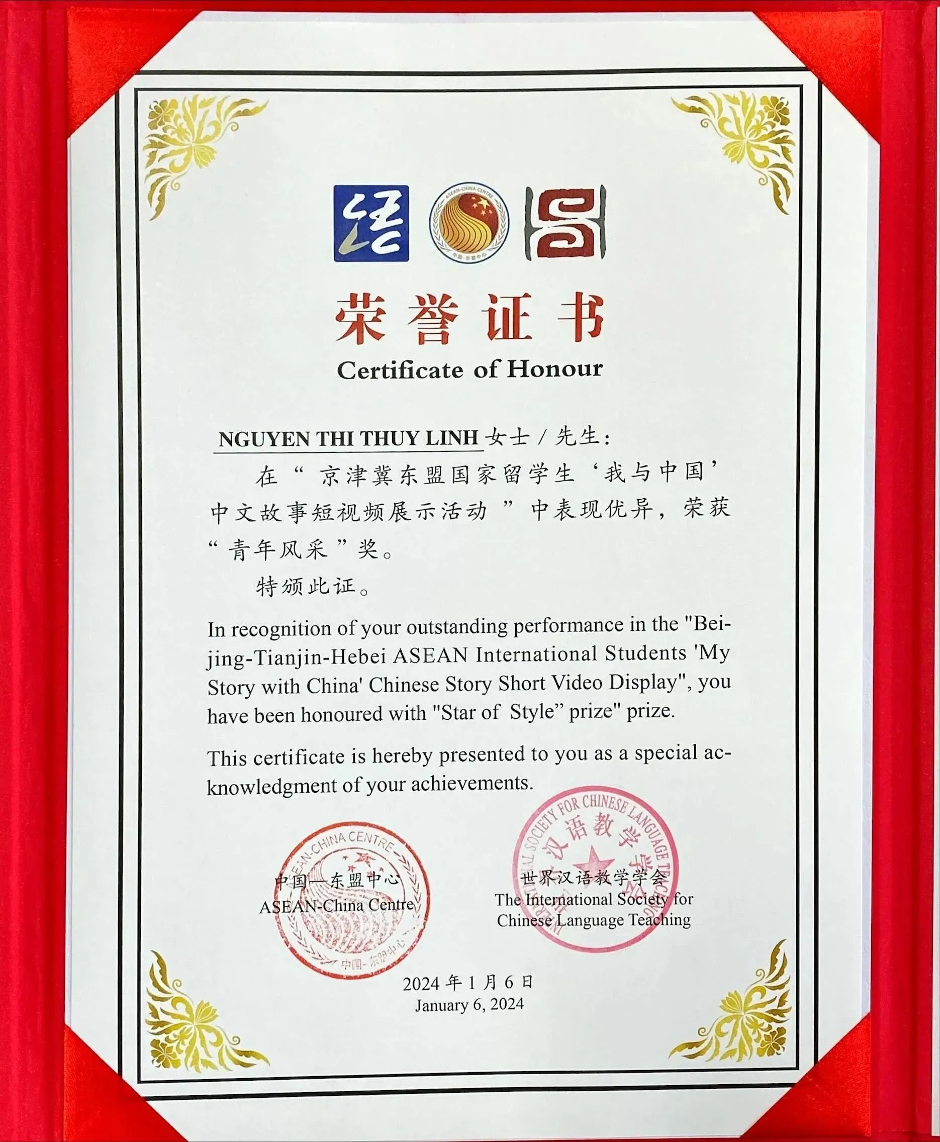 阮氏垂玲(NGUYEN THI THUY LINH)来华不到半年,即获得首届京津冀东盟国家留学生“我与中国”中文故事短视频比赛“青年风采”奖,下面是她的自述。