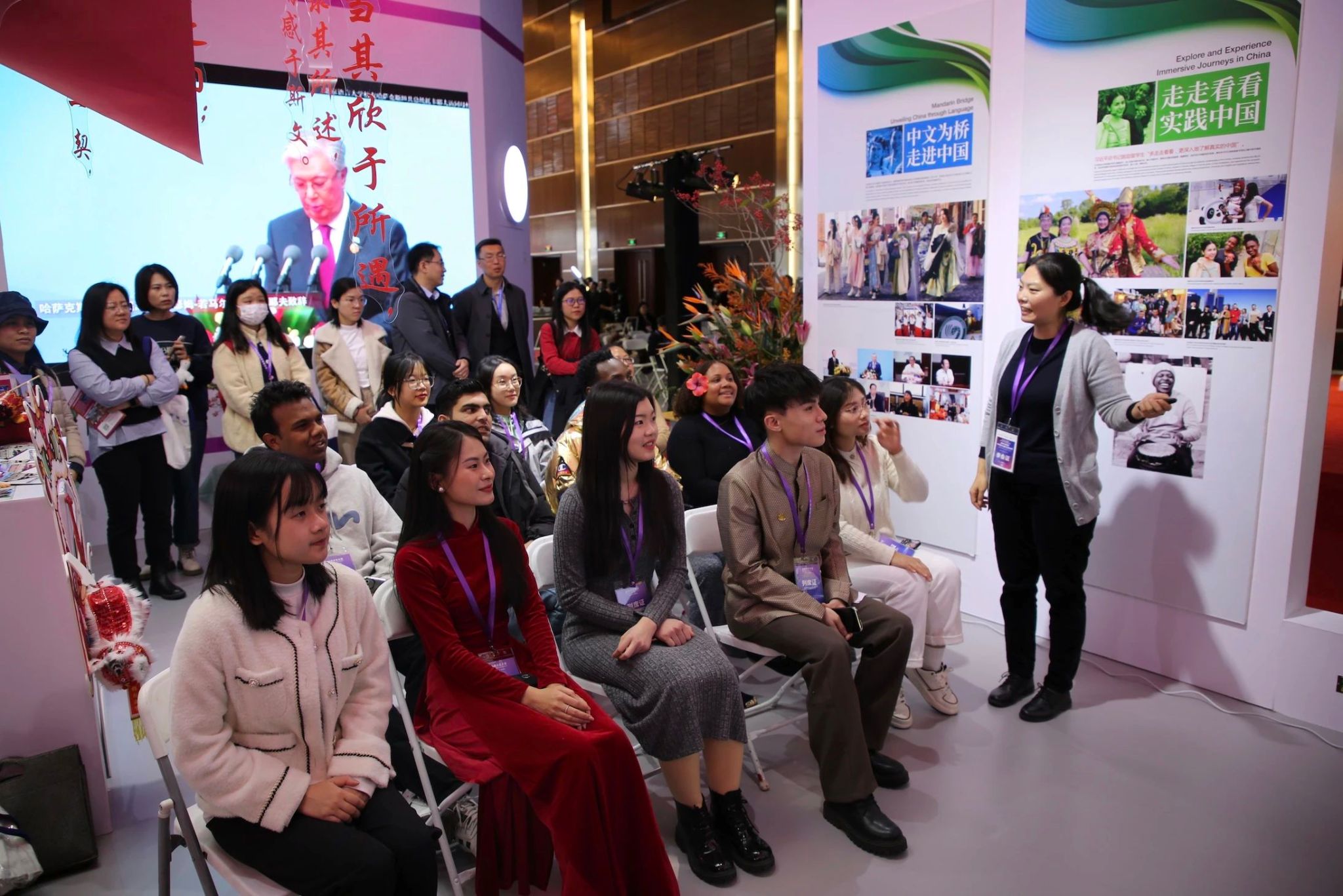 在世界中文大会的现场,你常常能看到国际中文学院中外学生的身影,他们或是穿着自己国家的传统服装为大会表演做准备,或是挂着志愿者的胸牌为大会的顺利进行保驾护航,工作之余他们在展会上互相切磋,时不时还要接受各大媒体的采访,成为会场上靓丽的风景。