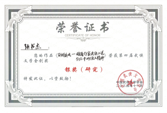 近日,由中国作家协会指导,中国武侠文学学会联合中共嘉兴市委宣传部、海宁市人民政府共同主办的第四届武侠文学金剑奖颁奖庆典在金庸故里——浙江省海宁市隆重举行。我院教师张书杰的专著《别样英风——旗籍作家武侠小说创作中的侠义精神》荣获第四届“武侠文学金剑奖”银奖(研究)。