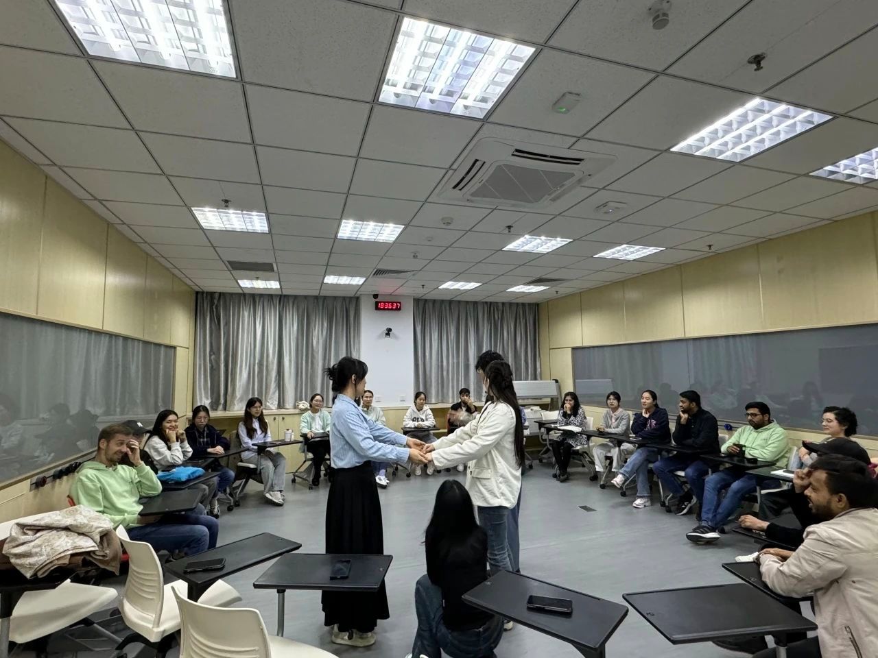 活动伊始,一系列精心设计的破冰游戏让同学们在轻松愉快的氛围中相互了解。每位同学都给自己起了一个有趣的昵称,并进行了自我介绍。随后,通过“大风吹”游戏,同学们不仅记住了彼此的名字,还了解了对方的国籍和爱好。