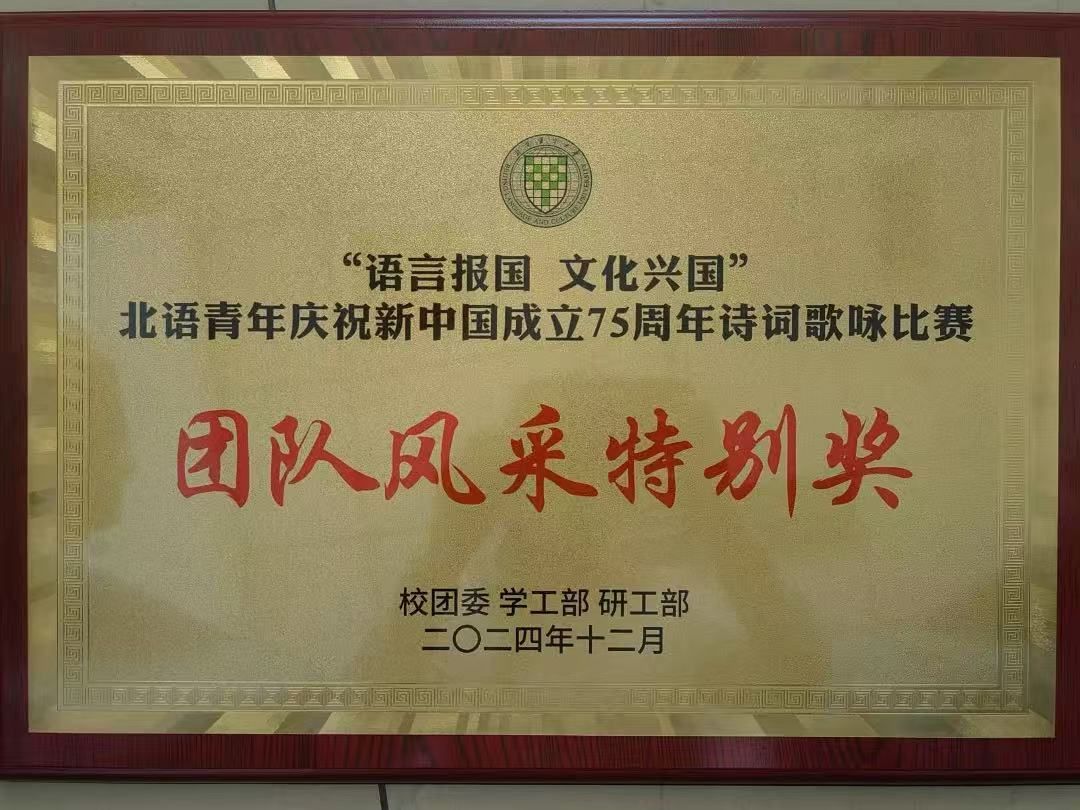 12月6日晚,“语言报国文化兴国”北语青年庆祝新中国成立75周年诗词歌咏比赛决赛在梧桐会堂圆满落幕。经过激烈初赛的角逐,共有10支来自不同学院的队伍脱颖而出,进入决赛。最终,我院代表队以其卓越的表现荣获“团队风采特别奖”。