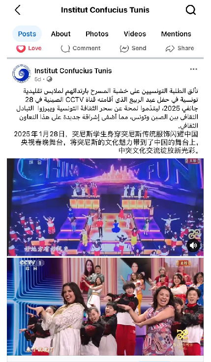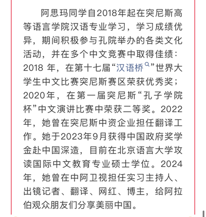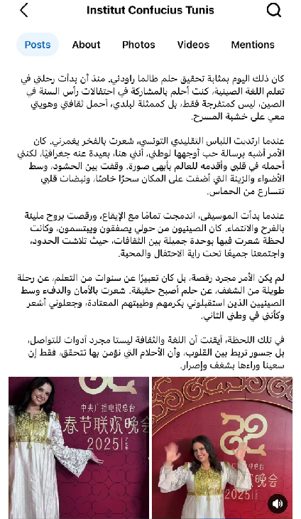 来自突尼斯的2023级研究生何映月表示:“我的家人们感到非常骄傲。以前,他们并不常看春晚,但因为我参加了这次节目,他们耐心地守在电视前观看直播。看完后,他们都表示后悔没有早点关注春晚。我的姐姐还把我的照片分享到了她的脸书上。迦太基大学孔子学院也发布了我的照片和感受。现在很多突尼斯汉语学习者都对春晚产生了浓厚兴趣,纷纷关注起这个节目。这一切让我深感自豪,也更加坚定了我作为文化交流使者的使命。”