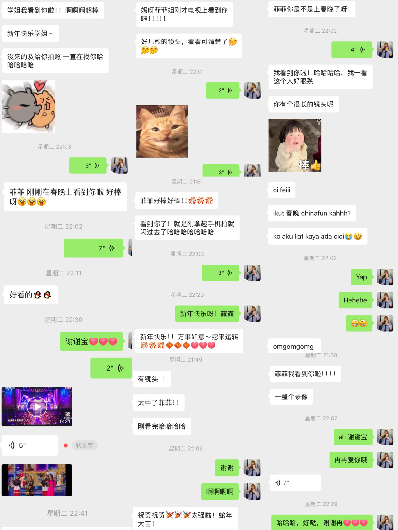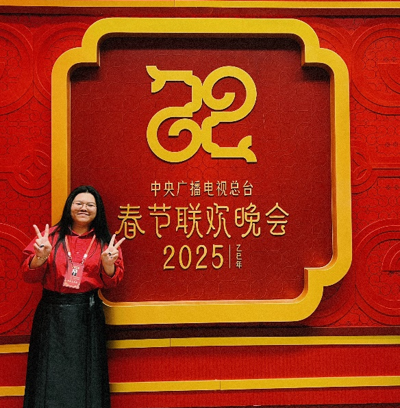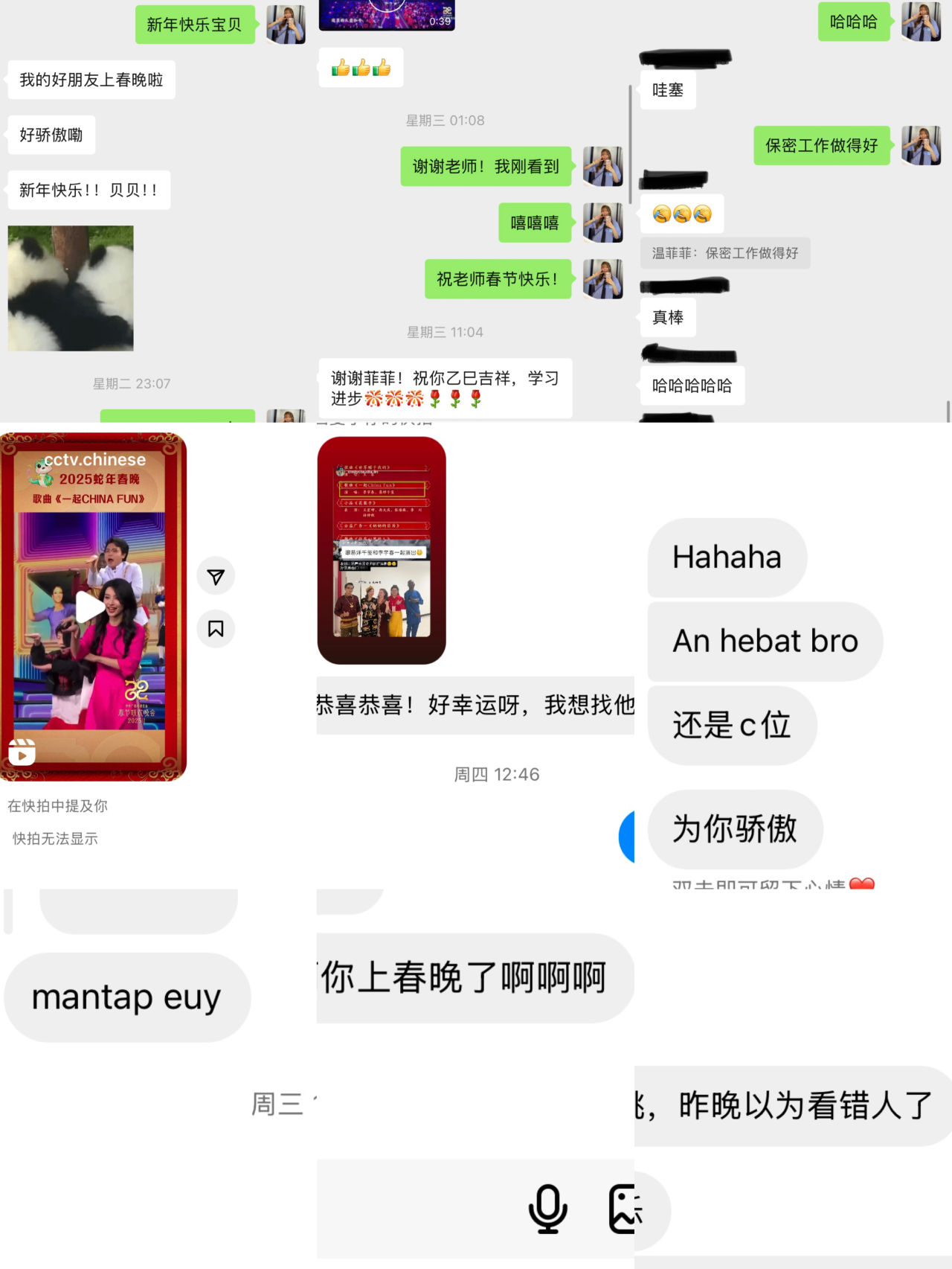 来自印度尼西亚的2021级本科生温菲菲表示:“《春晚》是我上过的最大舞台。给我的感受是开心且幸运的。我在晚会现场享受舞台、享受过年带来的气氛。我已经做到我自定义的完美了。当老师第一时间找我的时候,我就想‘我一定要争取到这个机会。’临近《春晚》不到一个月的时间改了又改,最终确定了节目。在面临未知而坚持努力着,在我们共同努力下终于站上了这个舞台。站在舞台上的那一刻,我就在心里暗暗地说‘我一定要把动作和表情都做到最好!’下台之后微信上弹来了好几条消息,问我是不是上春晚了,还说在电视看到我了。我立马语音回复,因为打字已经不能掩盖我内心的喜悦。我把演出视频发给家人的时候,他们说开错频道了,完美错过。我姐姐除夕那天忙,但是也在家里看了回放。毕竟我上电视了,她应该也为我骄傲吧。回顾刚来北京的时候,我从胆怯地上台表演,到大大方方地在台上跳舞,从小小的舞台,走向大大的舞台。这都是经验和勇敢带给我的‘荣誉与勋章’。”