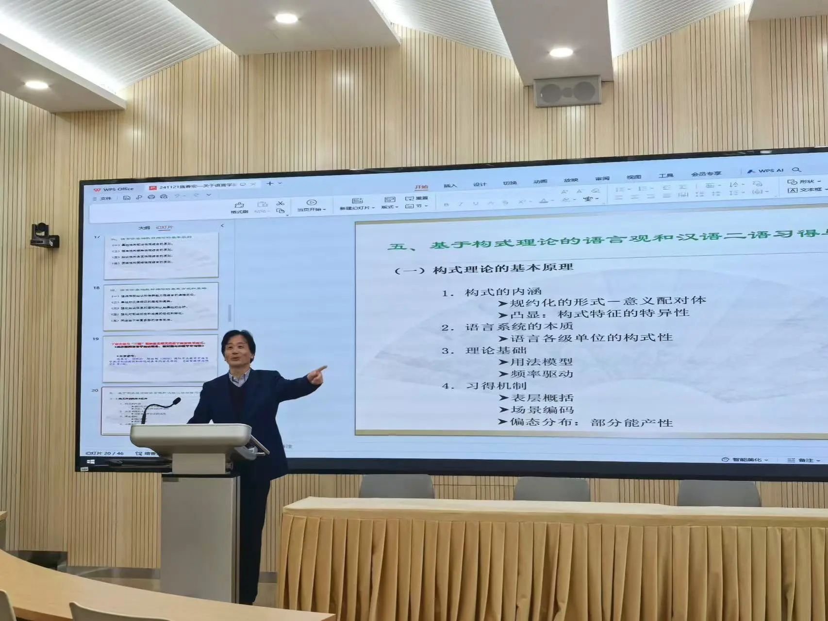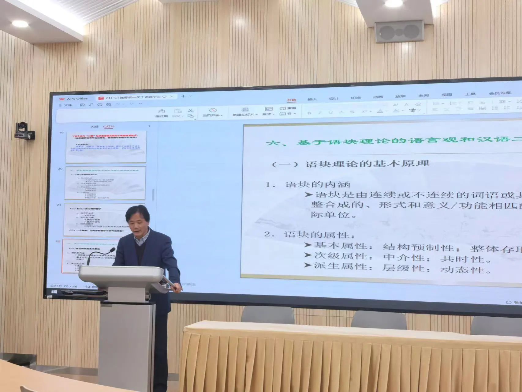 讲座的后半部分,施教授着重分享了他近年来在多个研究领域的最新成果,涵盖基于构式理论、语块理论、语体理论、韵律理论以及“三一语法”理论的汉语二语习得与教学探索,以及一系列新兴语言观在二语教学模式中的应用。最后,他总结归纳了国际中文教育的核心价值目标,指出不同的教育理念与目标将直接作用于教学内容的选择、教学路径的设计及教学策略的制定。