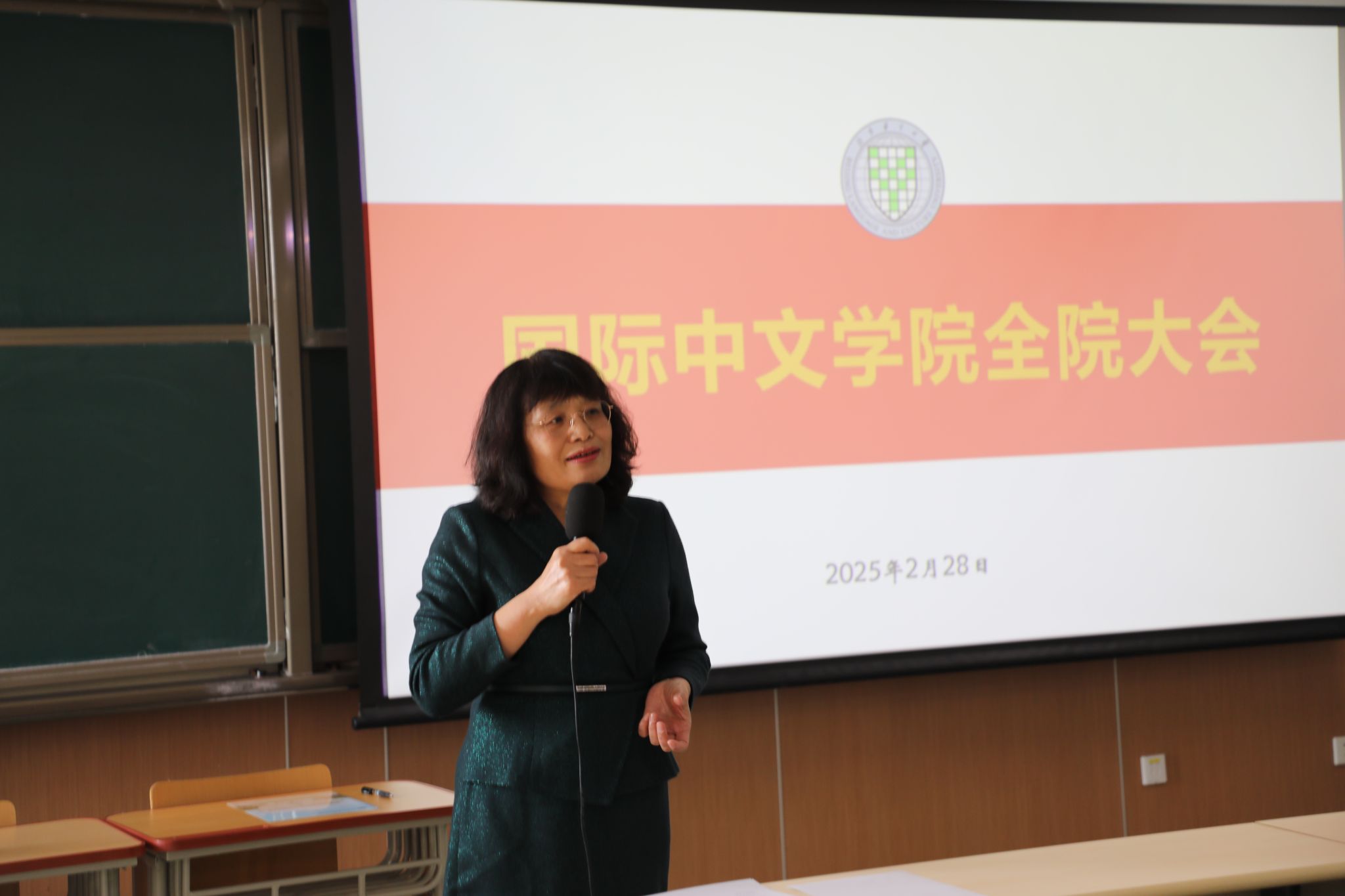 沈庶英院长首先对学院自2024年秋季学期期末以来的工作进行了全面回顾与总结。在过去的一段时间里,学院取得了诸多令人瞩目的成绩:本科生课堂教学质量评估的学生参评率首次突破80%,反映出学院教学质量的稳步提升;语言实践、教学观摩课、游学团以及冬季毕业生座谈会等活动顺利开展,为学生的全面发展搭建了坚实平台;2024中华文化大乐园印尼雅加达营的成功举办,更是获得了统战部的高度赞扬;国际学生登上春晚舞台,引发了中外媒体的广泛关注与热议;学院公众号“学生专访”系列专栏发挥了良好的示范作用,吸引了众多师生的目光;国际中文教育专博点建设工作以及教学、科研、育人、就业等各项工作在寒假期间稳步推进,成效明显。沈院长代表学院向全体教师表达了诚挚的感谢,感谢大家在过去一年中对各项工作的大力支持与辛勤付出。沈院长对学院下一步发展面临的形势进行了分析,鼓励大家在新学期,面对新形势、新挑战,凝心聚力、全力以赴、乘势而上,再创佳绩,为学院的发展注入新的活力。