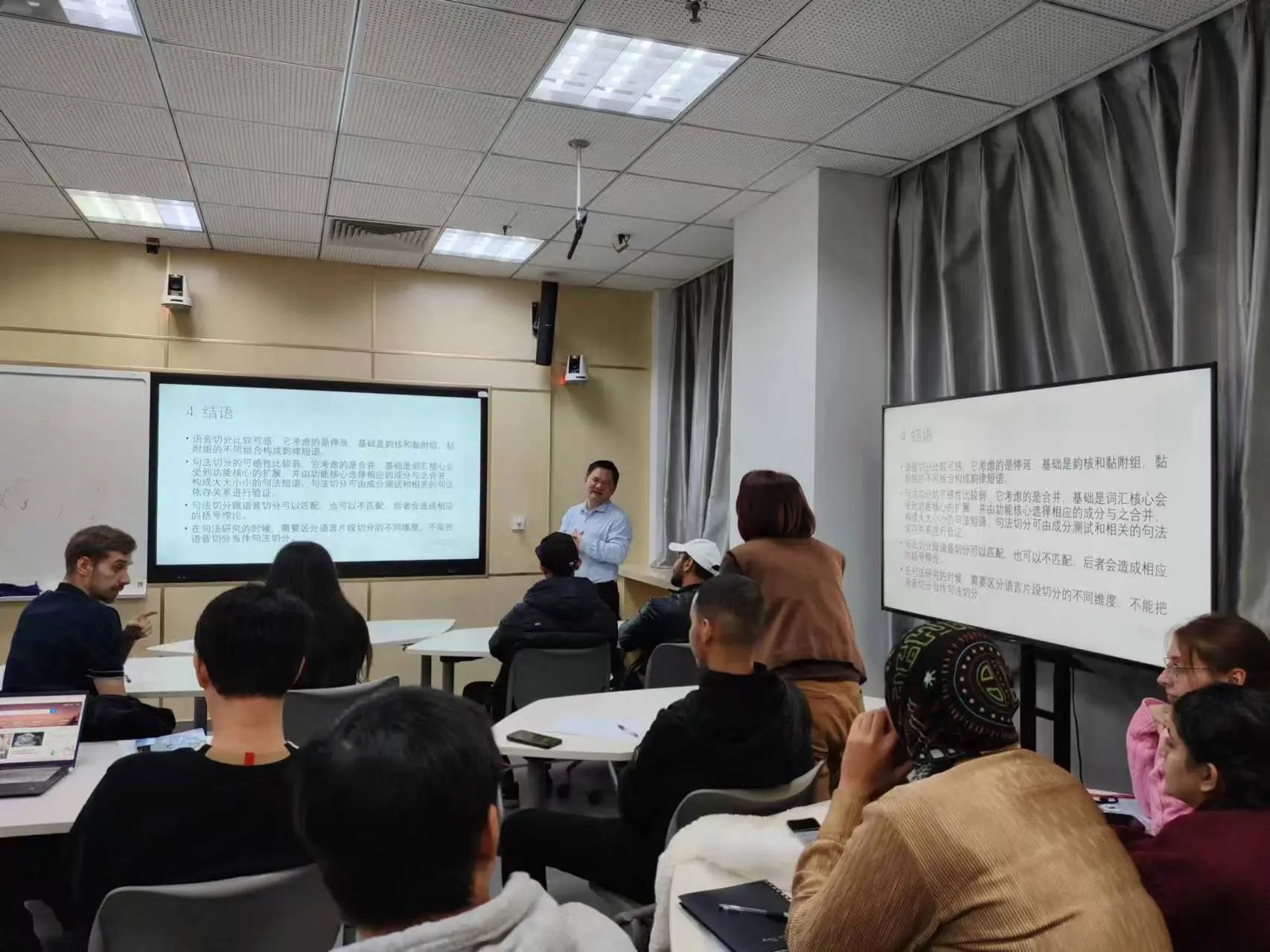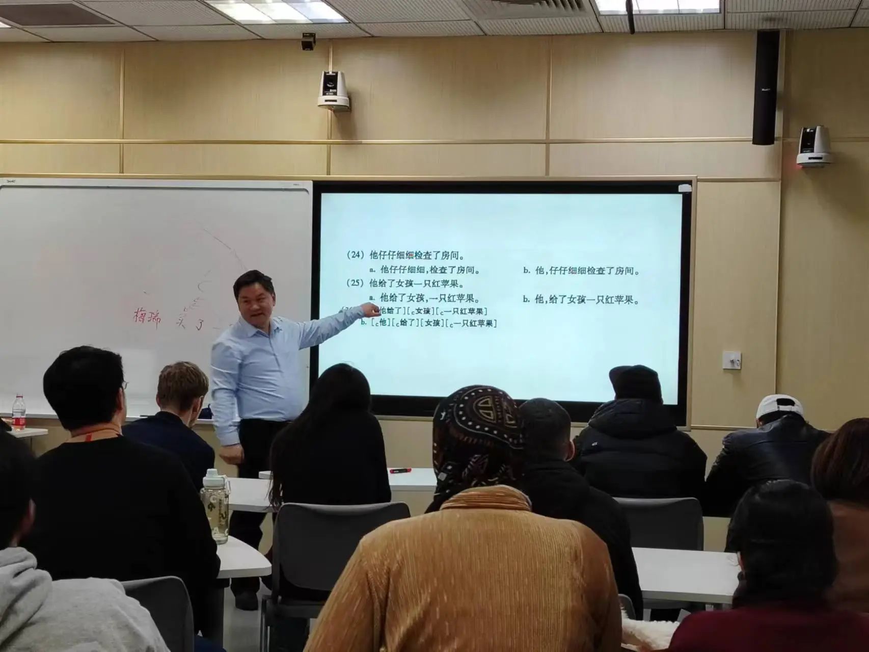 讲授过程中,熊仲儒教授旁征博引,循循善诱。他充分利用电子显示屏展示内容,还亲自手绘句法树,以直观、生动的方式帮助同学们更好地理解和掌握讲座内容。台下听众聚精会神,被熊教授的学识和风采深深吸引。