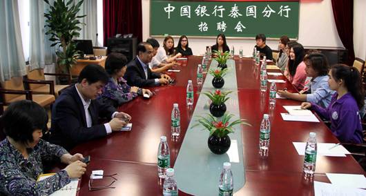 2015年5月21日上午,中国银行(泰国)股份有限公司张雷行长、崔华刚总经理以及中国银行北京中关村支行行长李培尊一行三人来我院招聘泰国毕业生。几位客人受到我院曹文院长、刘苏乔副院长以及经贸系系主任弓月亭、综合办公室主任陈蕾等老师的热烈欢迎。参加招聘会的有我院即将毕业的二十余位泰国学生。