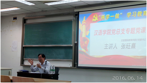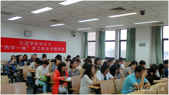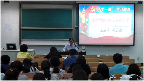 6月14日中午,为贯彻落实校党委“两学一做”学习教育实施方案,汉语学院党总支在教一楼701室召开了本学期第二次全体党员集中学习会,邀请汉语国际教育学部主任兼分党委书记张旺熹教授以《新时期共产党员的基本修养》为题,为党员教师讲了专题党课。汉语学院党总支全体党员参加了此次党课学习。党课由党总支代书记张浩主持。