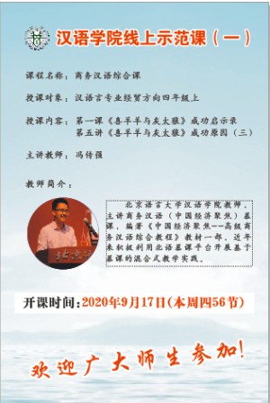 2020年9月17日下午14:00,汉语学院线上示范课系列观摩活动由冯传强老师的商务汉语综合课拉开帷幕。学部和学院领导张浩、陈蕾、朱彤和张俊萍以及学院多位老师参加了在线教学观摩活动。