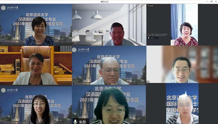 7月11日上午,北京语言大学校长助理、研究生院院长郭鹏出席开营仪式并致欢迎辞,国际中文学院院长沈庶英、党委书记梁彦民、应用中文学院院长苏英霞、汉语国际教育研究院研究员张宝林出席开营仪式,仪式由梁彦民书记主持。
