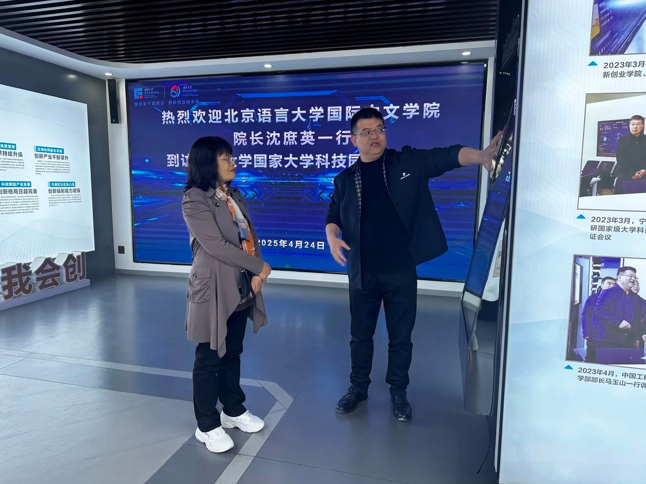 沈庶英院长一行首先到宁夏大学创新创业学院进行调研,参观了创新创业园区数字化展厅、数字化模拟实验室、创客咖啡空间、创客书吧。随后,双方共同观看了宁夏大学国家大学科技园宣传片、宁夏大学创新创业学院院歌。创新创业学院院长冯蛟详细介绍了宁夏大学校企合作项目“宁夏智慧文旅大数据平台”以及基于文旅大数据的数字人产品的研发情况,并重点介绍了创新创业学院与大学科技园在实践基地建设、数字化创新创业管理微专业、科技成果转化与科技企业孵化等方面取得的成效。