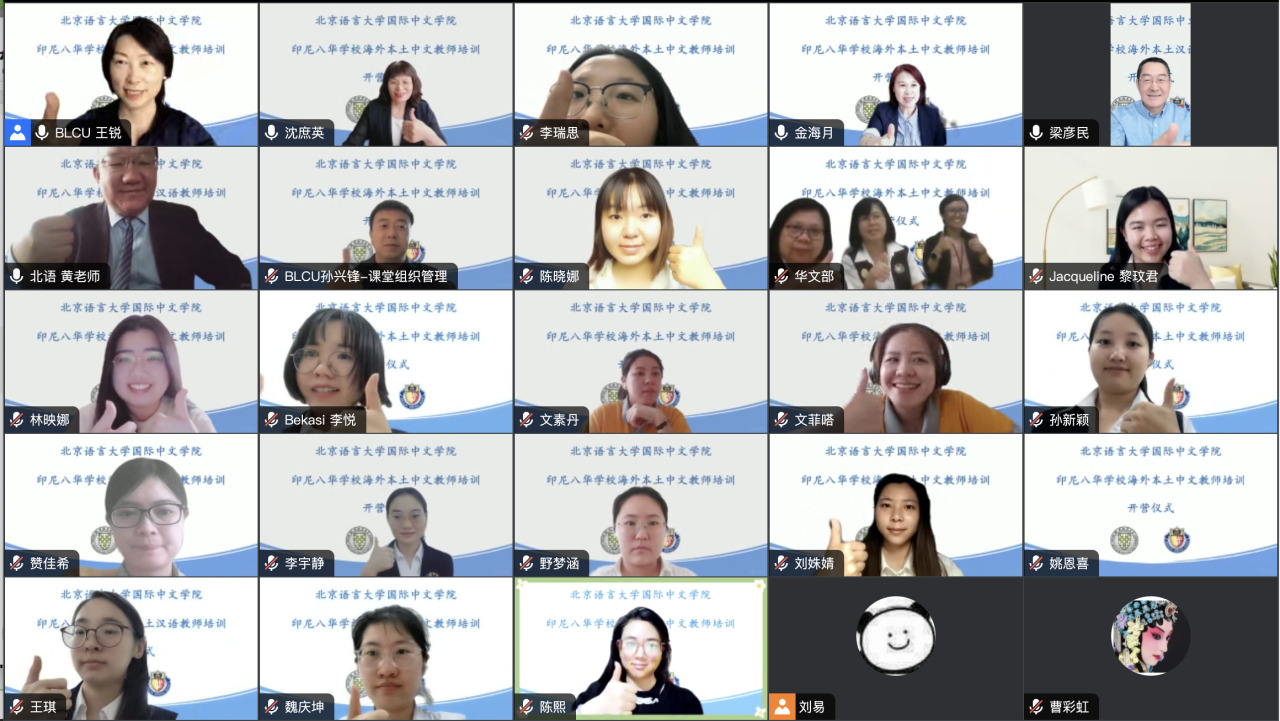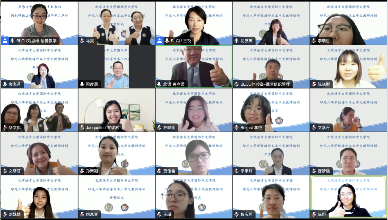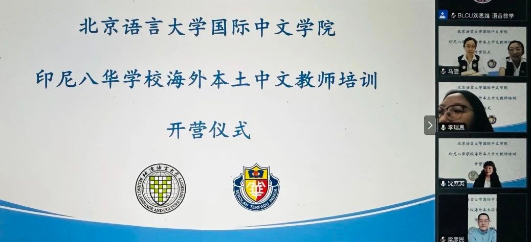 2025年5月6日,由北京语言大学国际中文学院主办的印尼八华学校海外本土中文教师培训班线上开营仪式顺利举行。此次培训旨在提升印尼本土中文教师的教学能力,推动国际中文教育高质量发展,深化中印尼两国在语言文化教育领域的交流合作。开营仪式上,北京语言大学国际中文学院院长沈庶英致开营辞,教师代表金海月、八华学校学术总经理Lia Soleman女士、八华学校学术副总经理 Conniewaty女士、全星学校Melva校长、八华学校幼儿园Jacqueline园长讲话,国际中文学院党委书记梁彦民、任课教师孙兴峰、黄柏林、刘思维、八华学校华文部席赫灿主任、八华学校Bekasi校区校领导代表Sophie女士及全体学员参加了开营仪式。仪式由北京语言大学国际中文学院八华学校海外本土中文教师培训项目负责人王锐老师主持。