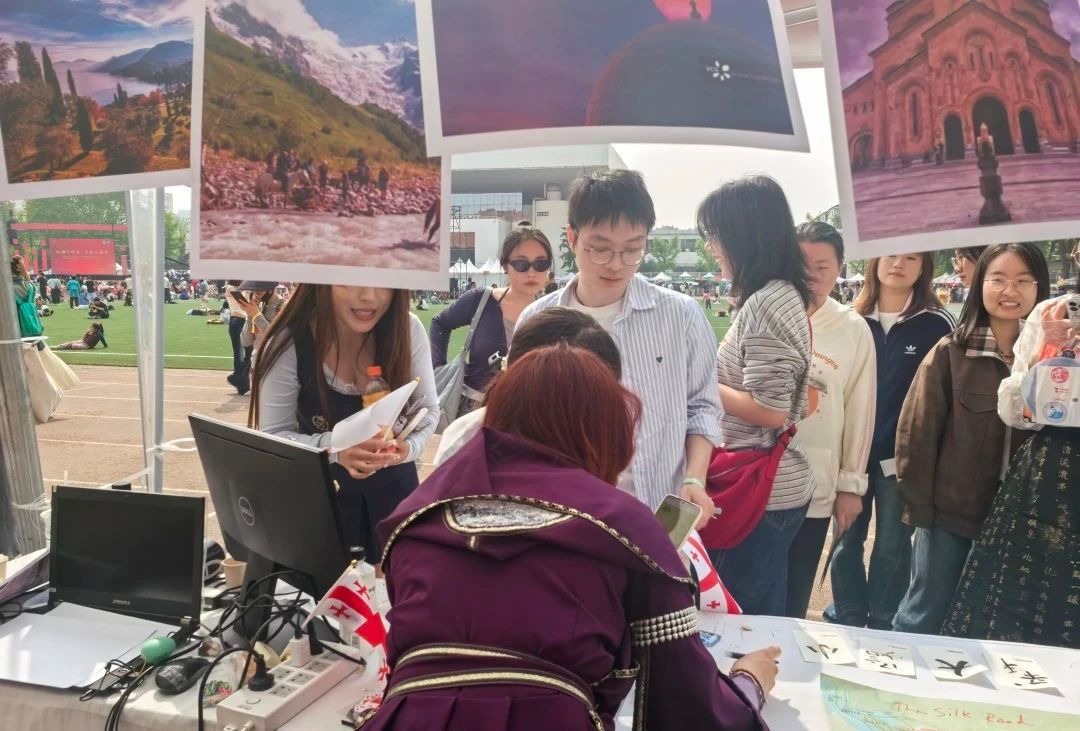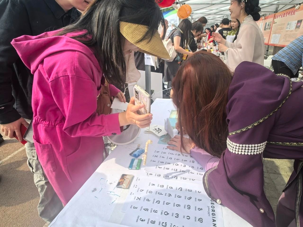 格鲁吉亚学生丽安娜精心准备了美丽的格鲁吉亚字母介绍,以及格鲁吉亚风景海报,吸引了非常多的游客来参观。丽安娜为每位游客在他们的打卡”护照”上面书写了他们名字所对应的格鲁吉亚文字,游客们感到非常新奇,纷纷想要了解每个符号的发音。