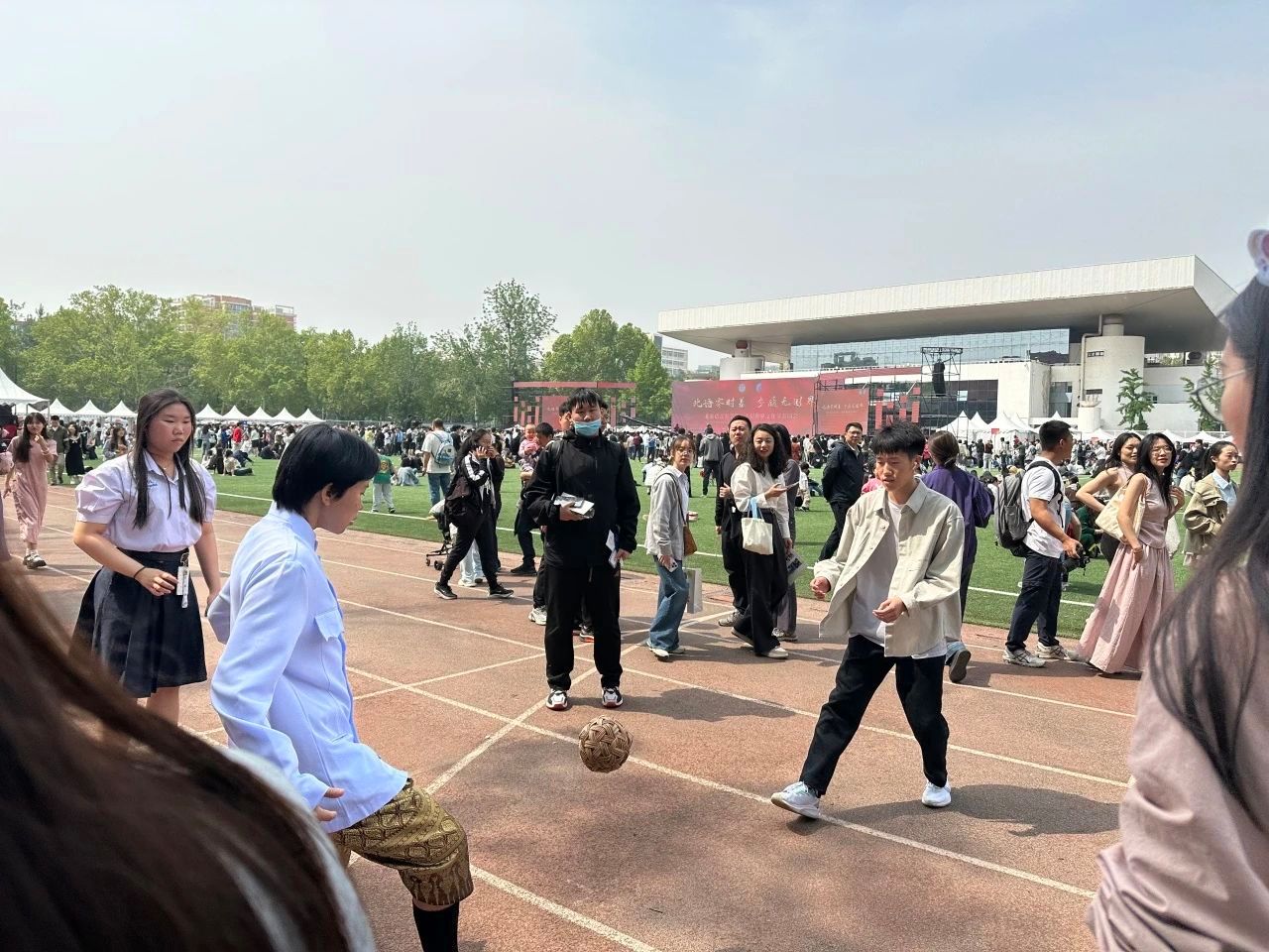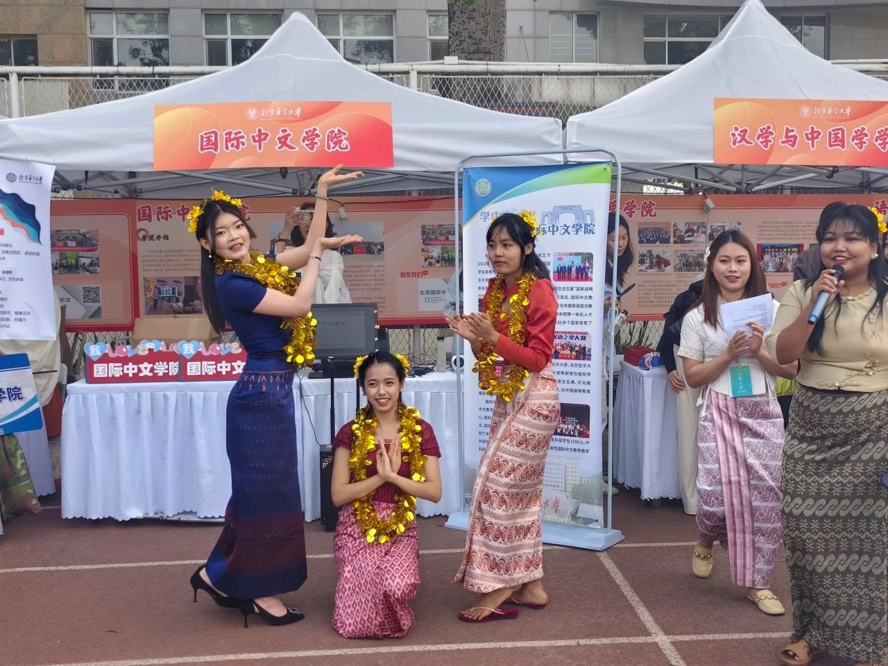 作为此次游园会国际中文学院首个登场的展台,缅甸同学以一场热情洋溢的民族舞蹈惊艳全场。身着金色刺绣筒裙的舞者们随同伴悠扬的歌声翩然起舞,手腕翻转如莲花绽放,脚步轻踏似雨打蕉叶,层层叠叠的欢呼与快门声此起彼伏。表演结束后,缅甸学生邀请观众现场学习基础舞步,展台充满轻松欢快的笑声。