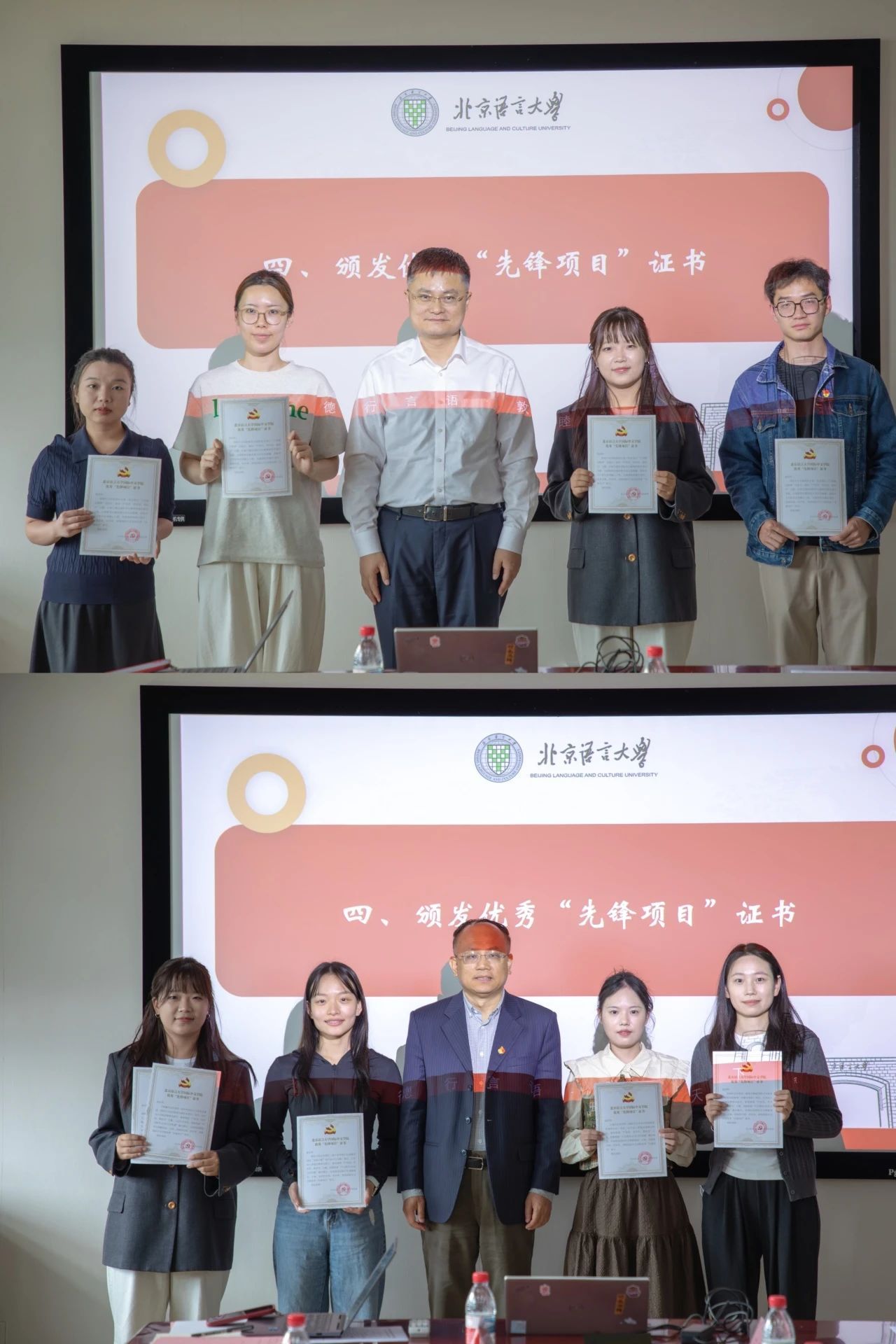 支部成员深入学习贯彻党的二十大报告精神,落实学校党代会部署要求,立足学院发展实际和国际中文教育前沿,主动响应“揭榜挂帅”号召,在急难任务中勇挑重担,以创新思维和务实行动开展了一系列“先锋项目”,在服务师生、教学实践、学术研究、文化传播等领域取得了丰硕成果。罗建晖副书记和郭鹏校长助理为“先锋项目”获奖支部与学生颁发了证书。