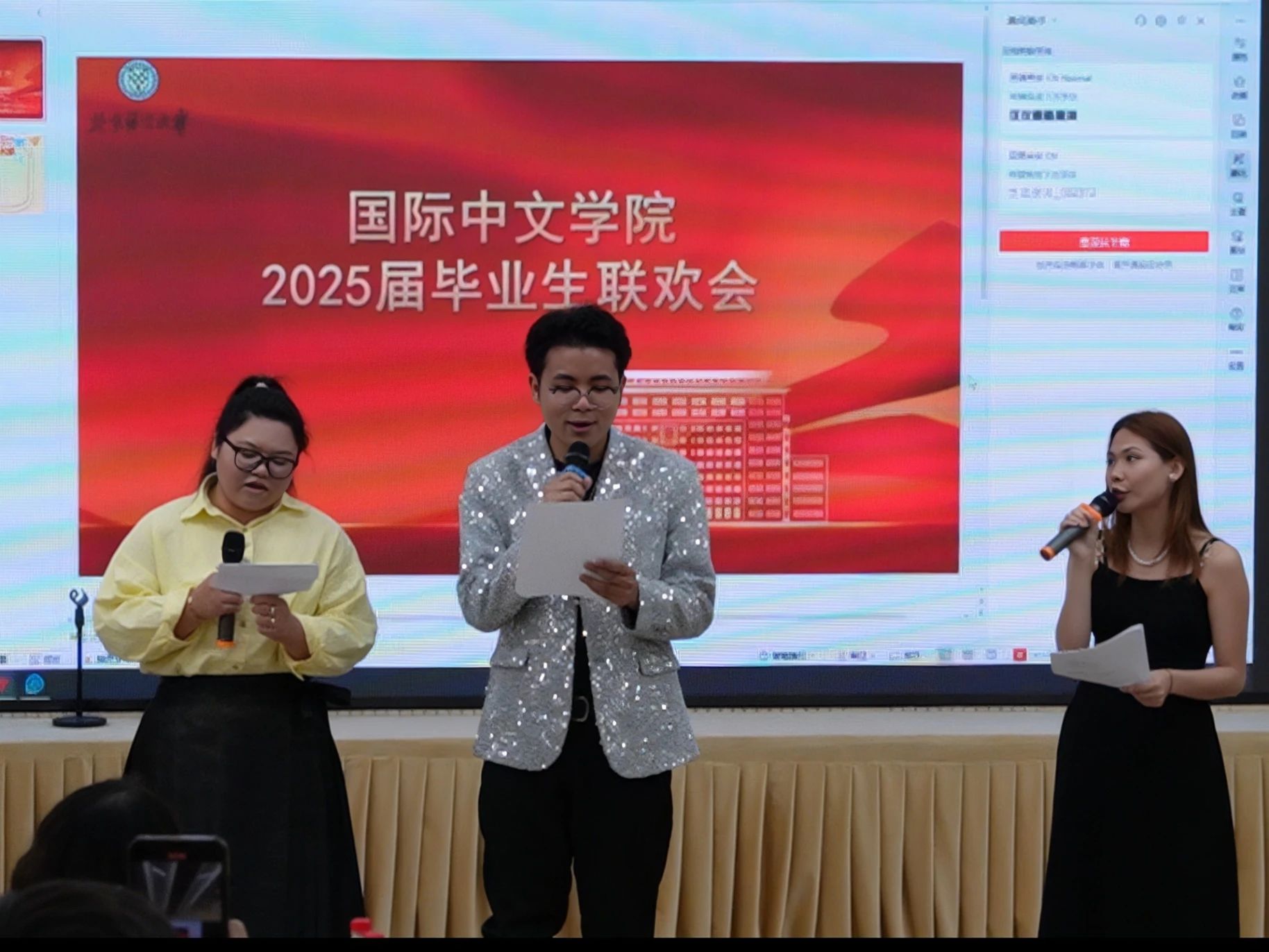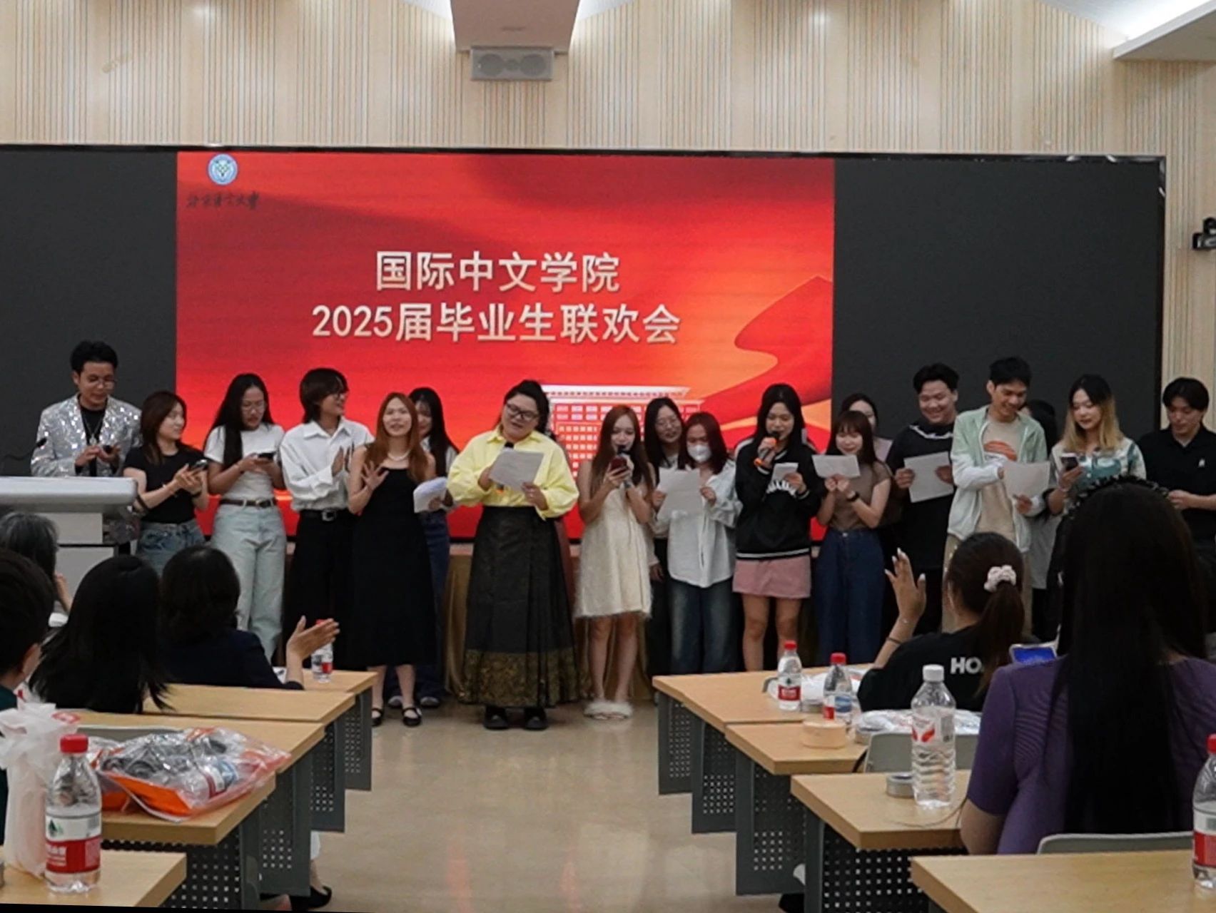 5月26日下午,国际中文学院于教二楼101教室举办了2025届本科毕业生毕业联欢会。国际学生处副处长王冬玲、国际教育管理处副处长王靓、校友会副秘书长耿淑梅、国际中文学院院长沈庶英、党委书记梁彦民、副院长朱彤、国际学生处于洋等领导出席了联欢会,为即将毕业的学子们送上最诚挚的祝福和期望。