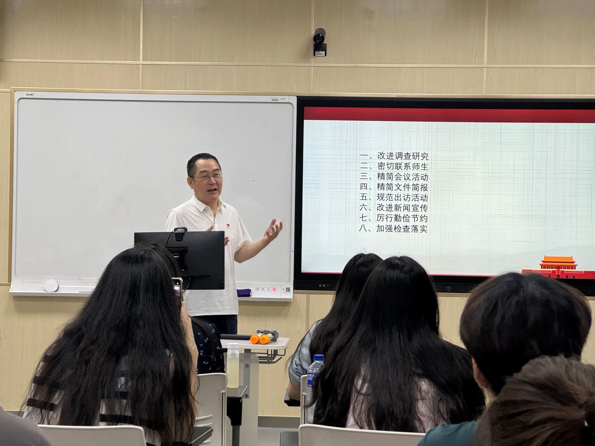 随后,梁彦民书记聚焦“切实改进以八项规定为统领的作风建设”,结合学院工作实际,进行了具体阐释分析。他详细解读了学校贯彻落实中央八项规定精神及实施细则实施办法的内容和要求,从教师的师德师风、学生的学风、求真务实高效、团结奋进的工作作风四个方面,强调要坚定不移改进作风,推动国际中文教育学科和学院的高质量发展。梁书记结合学校师德师风专项整治工作方案和学院研究生第三党支部主题党日活动的倡议精神,指出必须大力弘扬“求真、务实、高效”的工作作风,同时深刻阐明了“团结奋进”作风的极端重要性,要求全体党员干部发挥先锋模范作用,将学校关于国际中文教育改革发展的思路落到实处,团结一致推动事业发展。