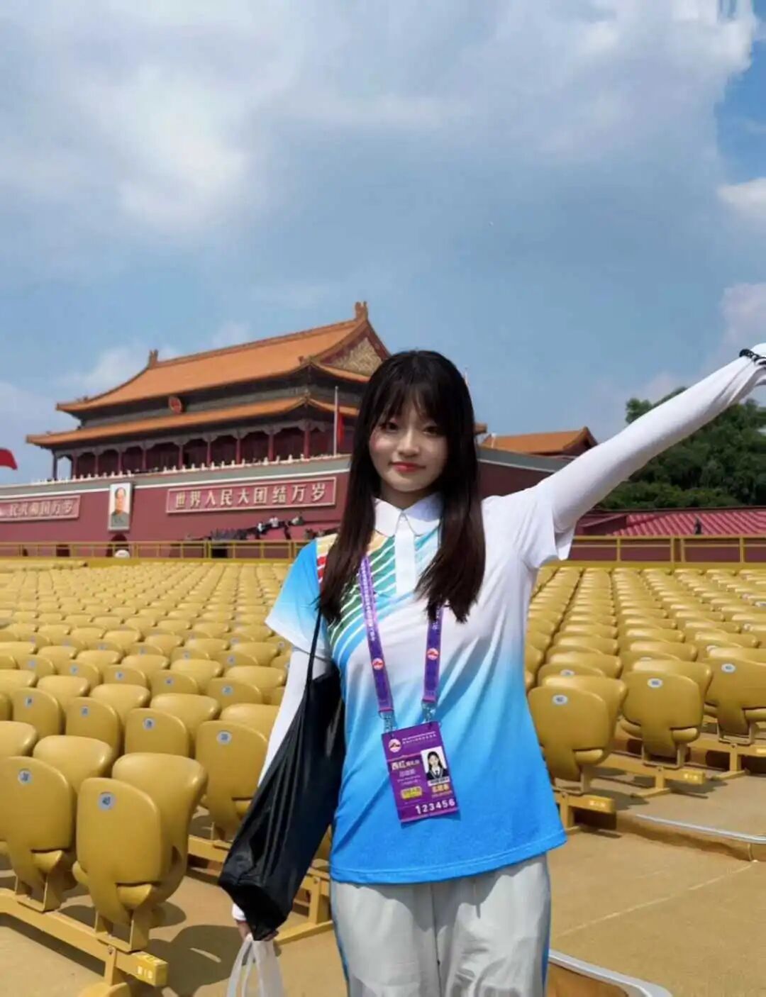 阅兵当天,天安门广场人声鼎沸。朝阳升起时,我站在岗位上,看着观礼群众有序入场,听着远处传来的激昂乐曲,心中满是振奋。值守过程中,我耐心为观众指引座位、解答疑问,即便长时间微笑让脸颊发酸,反复讲解让声音沙哑,可当听到一句句“辛苦了”,看到大家眼中的期待与敬意,所有疲惫都烟消云散。当纪念大会正式开始,看到空中护旗梯队26架直-19武装直升机展示“80”字样飞过,看到45个方梯队依次通过,听着回荡在广场的礼炮声,我的内心满是震撼,不禁想起先辈们浴血奋战的岁月——我们今日的坚守,正是对他们最好的告慰。