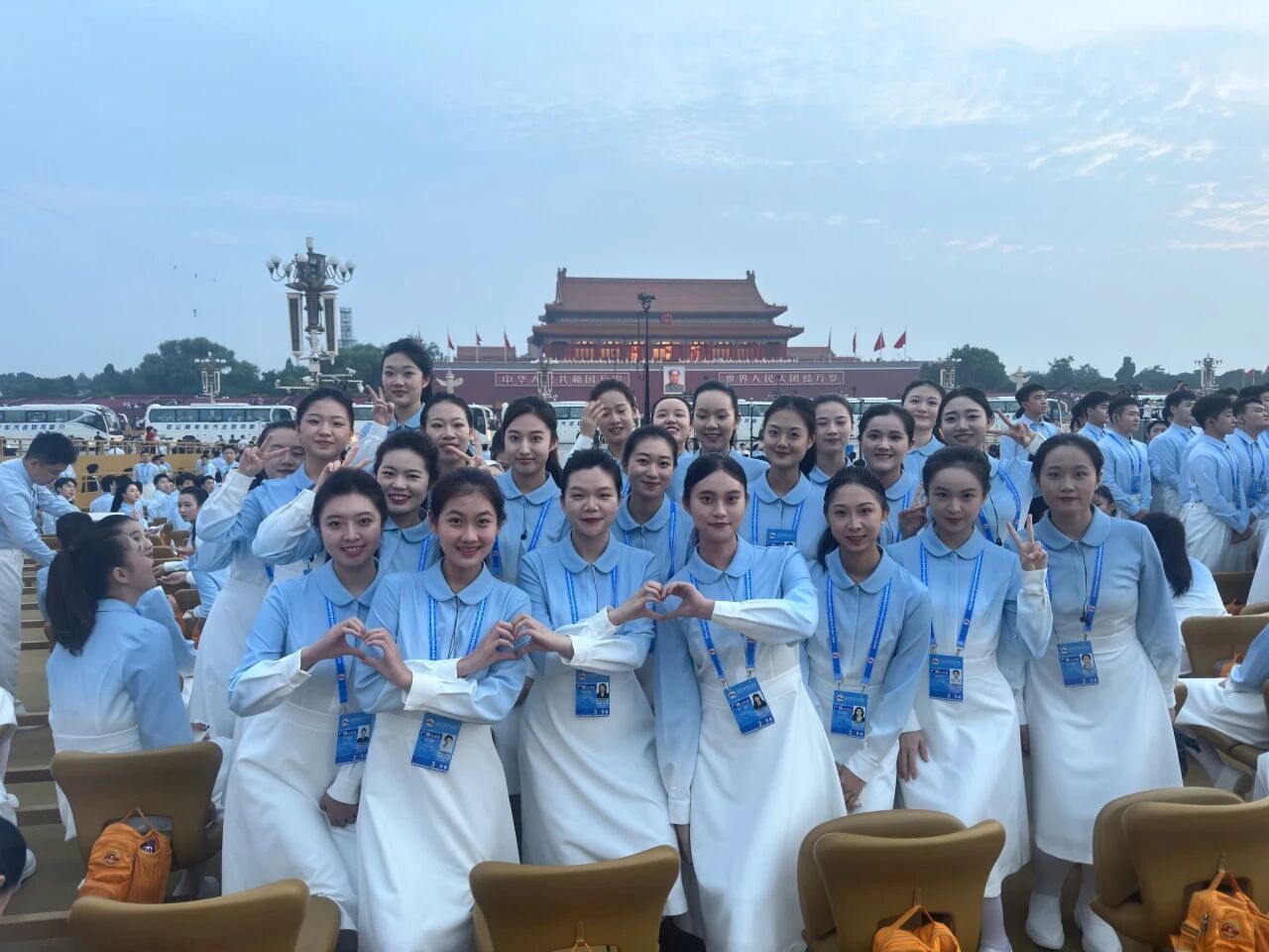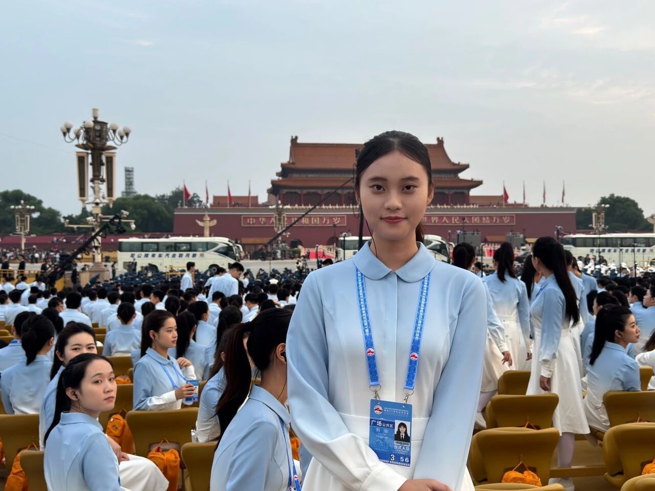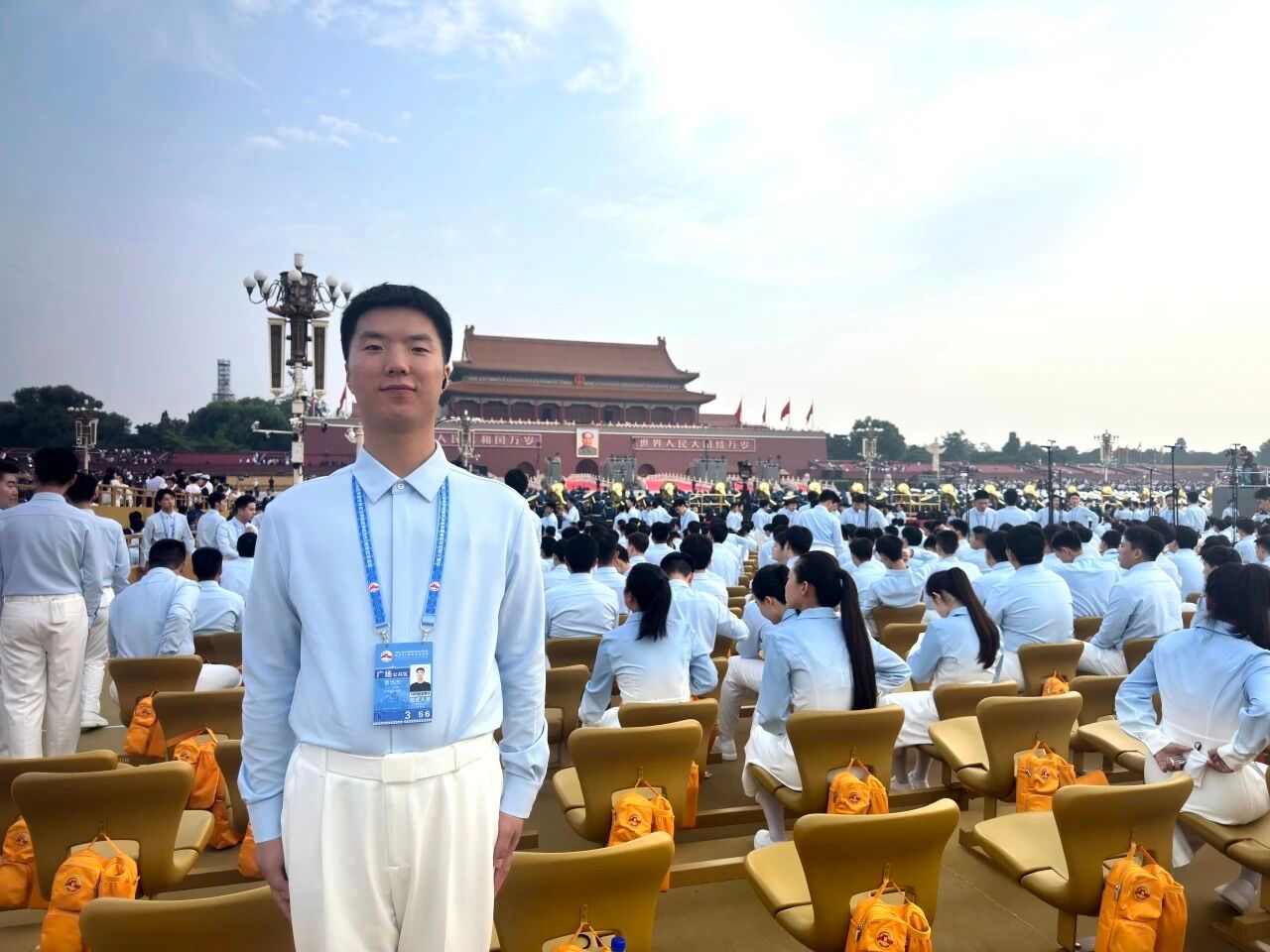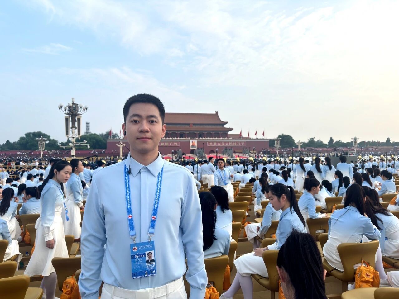 9月3日那天,从凌晨上车到夜里收队,我差不多24小时没合眼。太阳一出来就明晃晃地晒,眼睛都快睁不开,汗水顺着后背往下淌。为了准时入场,大巴在集结点一等就是几个小时,不能下车、不能喧哗也没有手机,大家就那么坐着、忍着,心里却一直盼着早点上场。轮到我们进场时,踩着节奏唱出第一句,所有的疲惫都被现场的气氛冲散了,只想着把每一句唱准,把歌里的感情传递出去。当最后《歌唱祖国》的旋律响起,看着和平鸽飞向天空,那一刻红、橙、黄、绿、深蓝、浅蓝交织成幕,那景象像一场无声的礼炮,把“和平”写满天空,我心里又暖又激动。现在回想,那一天的暴晒、等待和坚守,都成了我和这段历史的共同记忆。