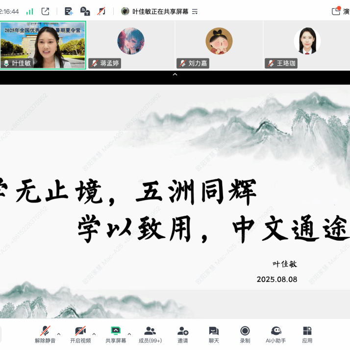 8月7日上午,北京语言大学国际中文学院2025年夏令营在线开营仪式准时举行。研究生院副院长李文成、国际中文学院院长施家炜、学院党委书记梁彦民、副院长朱彤、科研助理金海月、教学助理王锐、副处级组织员高美娟云端出席,仪式由梁彦民书记主持。