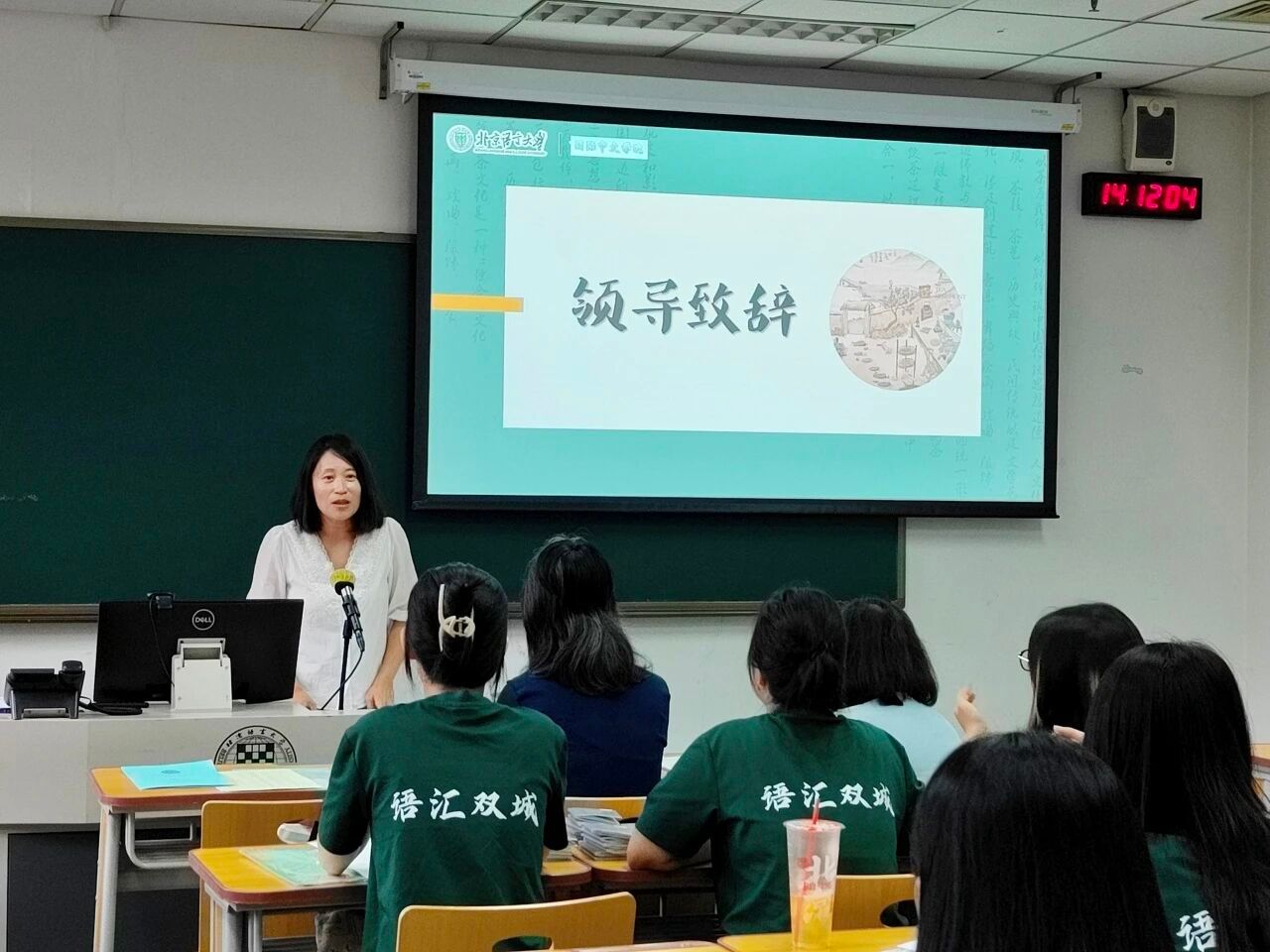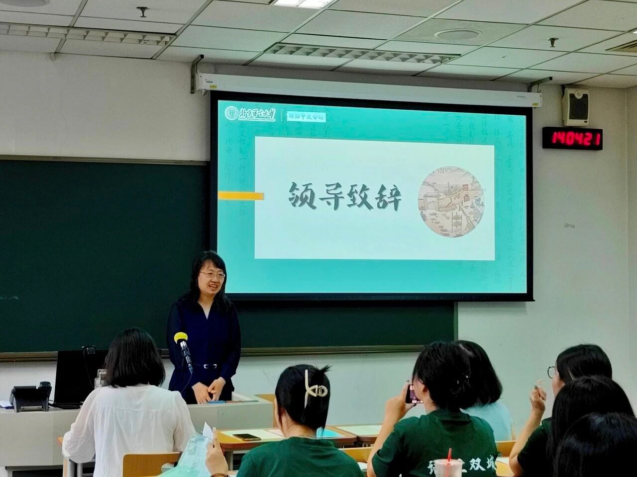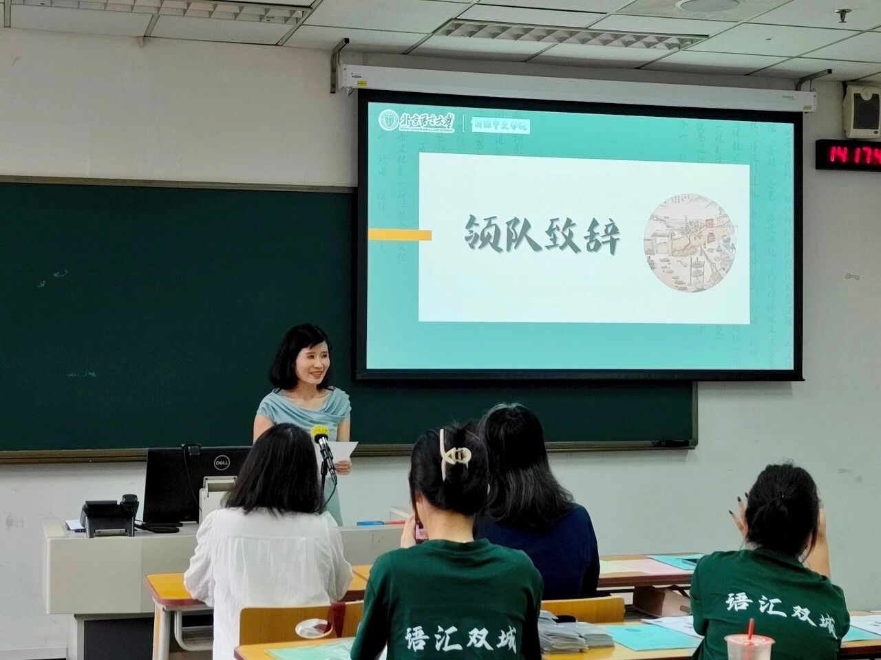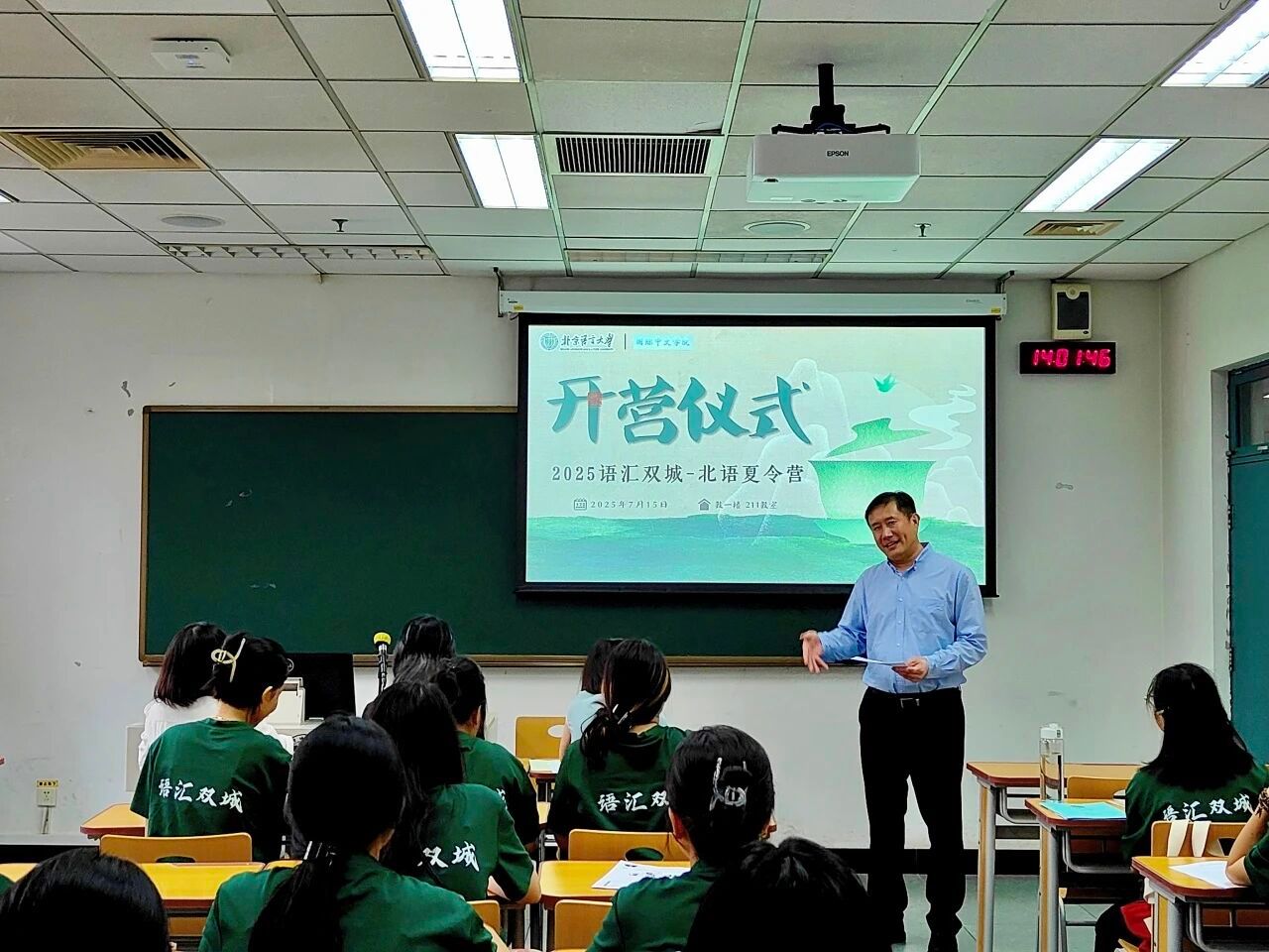 朱彤副院长发表致辞,她向学员和带队老师的到来表示欢迎,并以“语言既是钥匙也是桥梁”这一比喻表示对学员们来华学习的支持与鼓励。朱老师详细介绍了接下来两周时间里本次夏令营的具体安排,包括专业课程和文化体验课程内容。同时,她鼓励营员们在群山环抱中感受长城的巍峨壮阔,在雕梁画栋中读懂中国古典园林之美。最后,朱老师祝学员们在北京收获多多,将最美好的回忆留在2025年夏天。