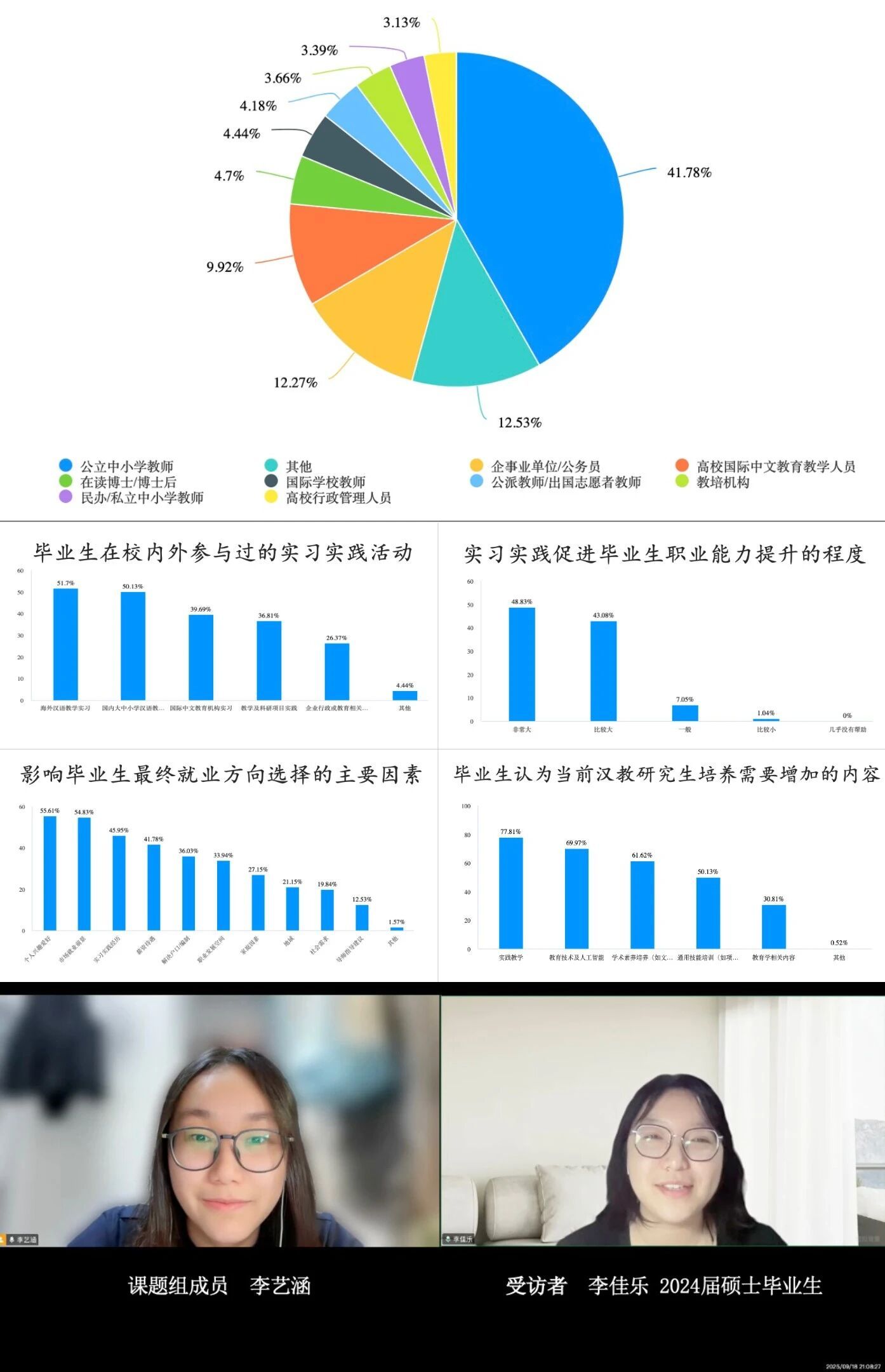 在总结交流会上,梁彦民老师团队通过理论学习与实践研学相结合的方式,深刻认识甲骨文化的重要性,探索甲骨文化传播路径与传播体系创新。闻亭老师团队对383名国际中文教育专业的中国硕士毕业生展开了调研,分析在校教育对毕业生发展的推动作用,并从实践、校友、全人教育三个角度提出了毕业生发展与教育教学创新的方向。