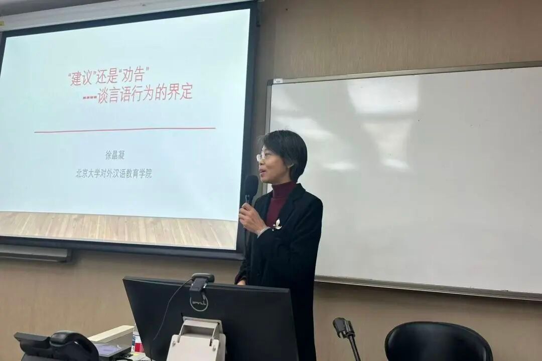 2025年12月3日下午,国际中文学院在教五楼123教室举办“传承与创新”系列讲座。本次活动作为“北京语言大学2025年研究生教育质量提升系列活动”之一,特邀北京大学对外汉语教育学院徐晶凝教授担任主讲,围绕言语行为理论中“建议”与“劝告”的界定与区分展开深入讲解。讲座由国际中文学院《汉语国际教育学报》编辑部赵果教授主持,吸引了校内外100余名师生参与,现场座无虚席,交流气氛热烈。