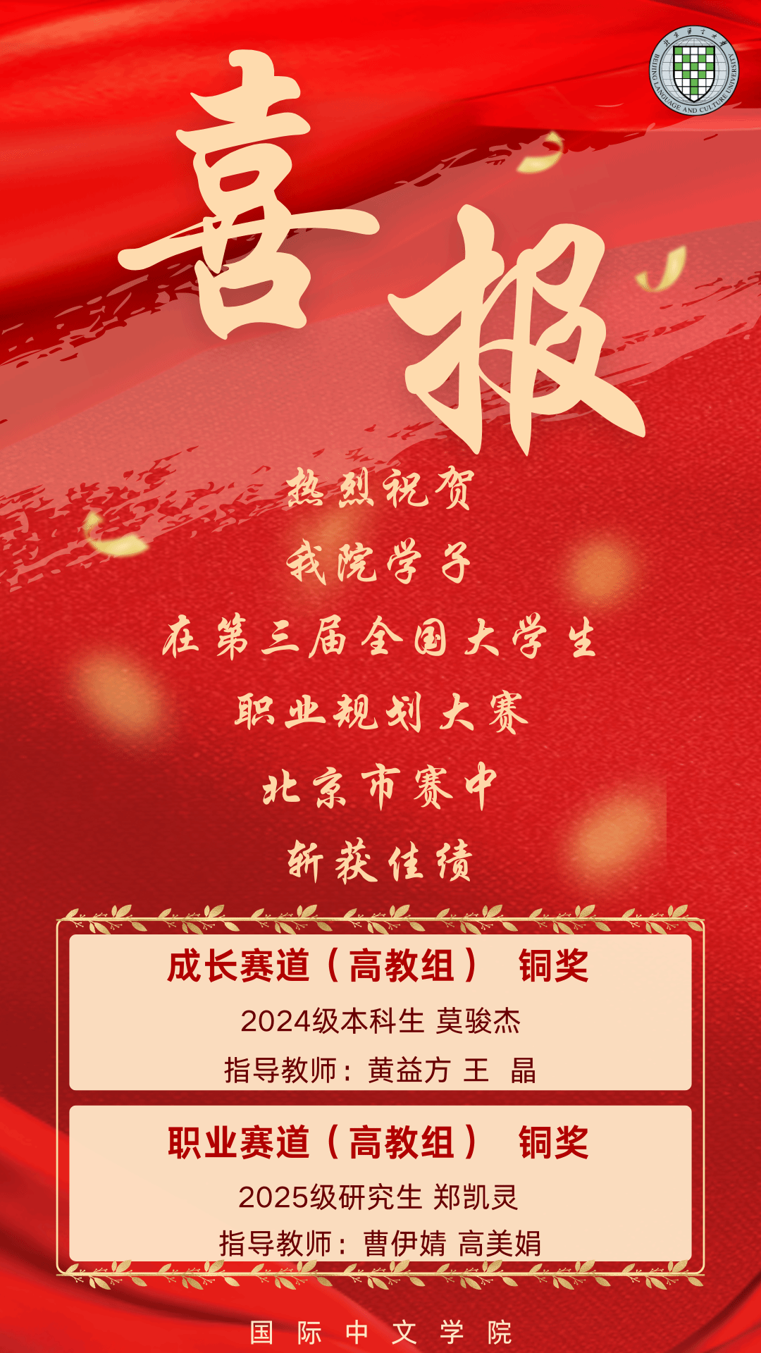近日,第三届全国大学生职业规划大赛北京市赛圆满落幕。经过多轮激烈角逐,我院2024级本科生莫骏杰、2025级研究生郑凯灵凭借清晰的职业定位、扎实的专业功底和出色的现场表现,分别荣获成长赛道铜奖与就业赛道铜奖,充分展现了国际中文学院学子卓越的职业素养与综合能力。
