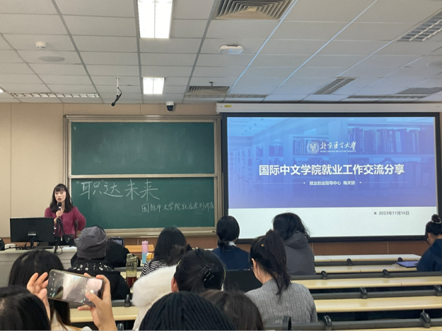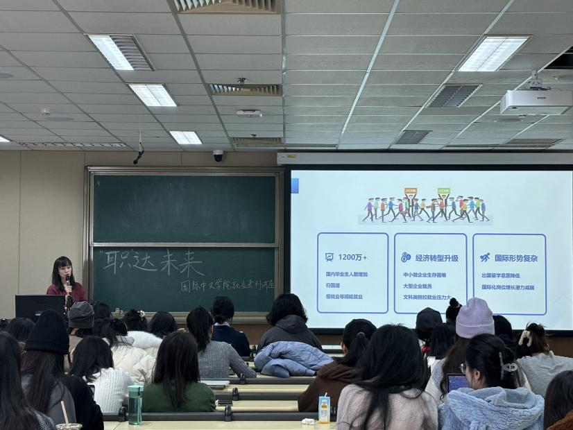 讲座在轻松愉悦的气氛中顺利开始,梅老师向大家简要介绍了就业创业指导中心的相关工作,并从汉语国际教育专业学生去向情况、2024年毕业生就业形势、简历制作和招聘信息获取渠道四个方面介绍与同学们密切相关的就业知识。